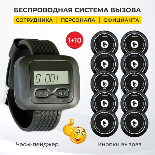 1. Пейджер в ресторан для кнопки вызова персонала, официанта. Часы для официантов серия «эконом» от российского бренда ARHIS PRO применяются в составе беспроводной системы вызова персонала. Часы пейджер являются приемником сигнала вызова от кнопки и отображают его на своем экране. Часы для официантов и персонала используются для улучшения коммуникации между сотрудниками и посетителями: в ресторане, кафе, баре, медицинском центре, промышленном предприятии или другом заведении для вызова сотрудника к посетителю. Посетитель нажимает на кнопку вызова (можно приобрести в нашем магазине ARHIS PRO) и сотрудник получает сигнал оповещения на наручный пейджер. В память часов пейджер вызова официанта можно запрограммировать до 500 кнопок передатчиков сигнала. Пейджер оповещения официанта «эконом», черного цвета, работает от заменяемой батарейки ААА - 1.5V, носится на руке, радиус чувствительности приема сигнала от кнопки вызова составляет до 500 м. (зависит от мощности сигнала кнопки), после получения сигнала о вызове пейджер издает световой, звуковой и вибрационный сигналы - настройки можно выбрать индивидуально. На лицевой стороне корпуса имеется однострочный экран отображения вызова, обозначение вызова указывается в виде цифр, а под дисплеем две клавиши для настройки и управления пейджером. С задней части корпуса часов для официанта расположен отсек с крышкой под батарейку.