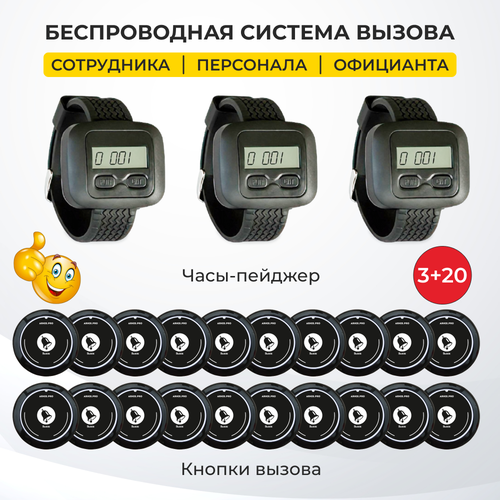 Кнопки вызова персонала и официанта и часы-пейджер. Комплект системы вызова персонала: кнопка Смайл "Вызов" - 20 шт, пейджер "Эконом" - 3 шт. Дальность 300+ м.