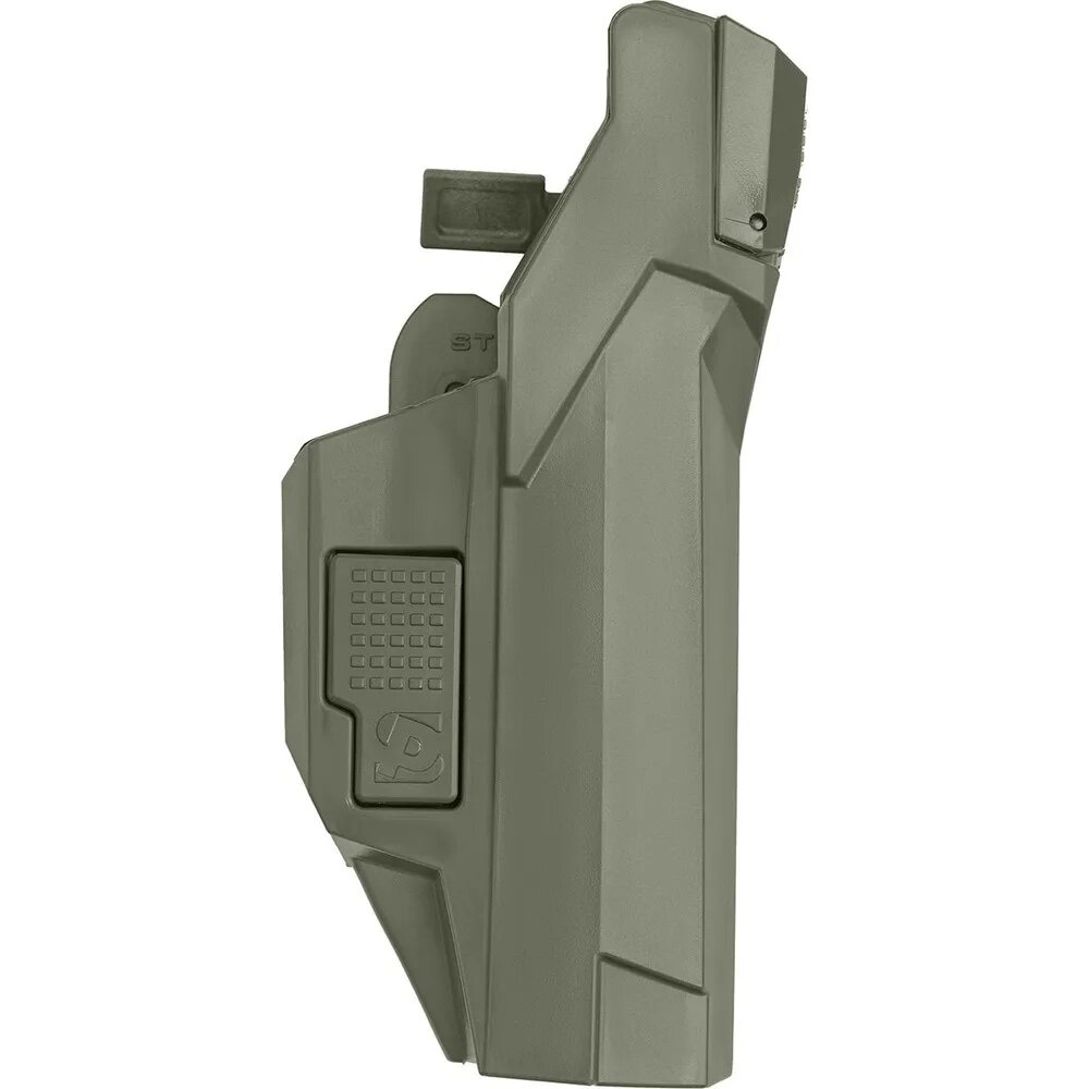 Наличие второй точки фиксации позволяет более надежно удерживать пистолет в кобуре, что защищает владельца от несанкционированного извлечения оружия. С другой стороны, наличие дополнительной точки фиксации не мешает быстро извлекать пистолет. Для этого достаточно одним щипковым движением большого и указательного пальца одновременно нажать на рычаг и кнопку удержания.