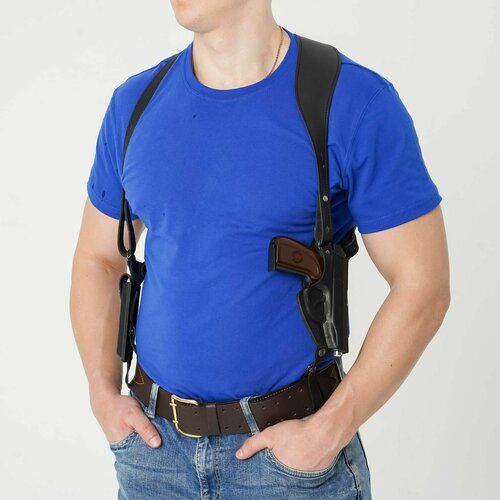 Оперативная плечевая кобура вертикальная с пеналом чехлом для запасного магазина обоймы и креплением кобуры к поясу предназначена для переноски пистолета Пенал рассчитан на стандартный 8 зарядный магазин! Кобура наплечная изготовлена из натуральной кожи толщиной до 3х мм. Основной плечевой ремень (несущий) имеет расширение в районе плеча, что позволяет снизить нагрузку на плечо. Плечевые ремни регулируются по длине. Кобура иммет кольцо крепления к ремню для дополнительной фиксации оружия в требуемом и удобном местоположении и прорези для ношения на ремне в качестве поясной при снятии пречевых ремней. Сама кобура оснащена страховочным хлястиком предотвращающим выскальзывание пистолета из кобуры. Открытие хлястика производится большим пальцем. Кобура для правши - пистолет распологается под левым плечом. При первичном использовании кобура принимает размеры пистолета - особенность свойства натуральной кожи - через 2-3 недели начала использования, оружие свободно и легко извлекается из кобуры.