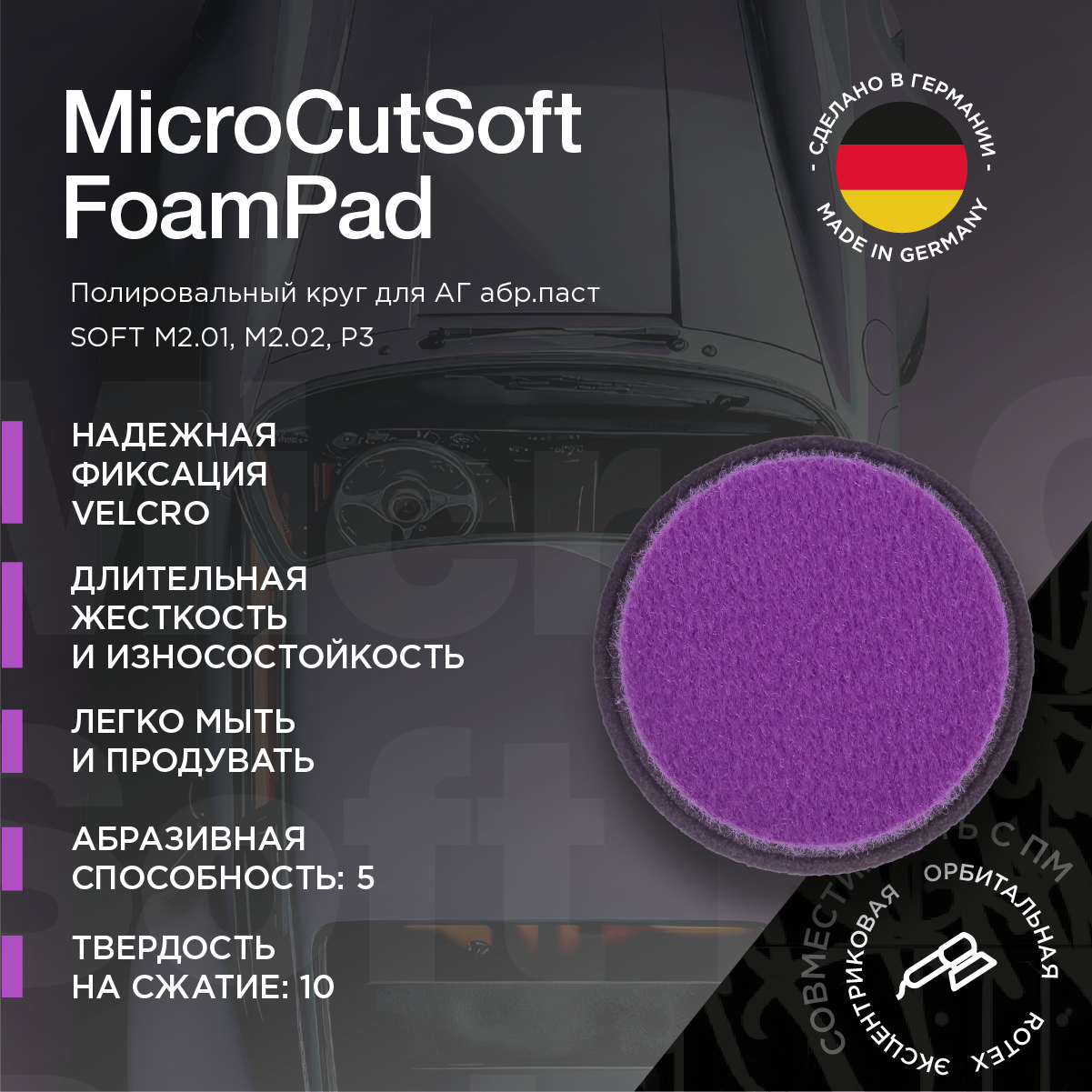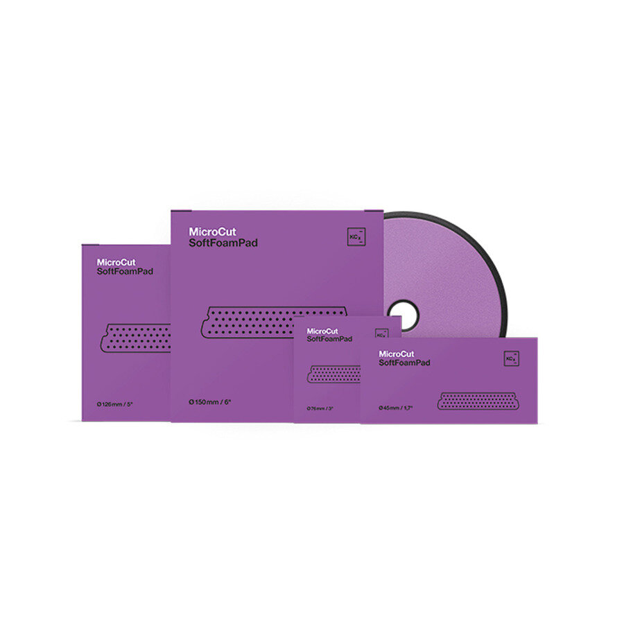 Специальное обновление поролон для Micro Cut Pad. Мы приложили много усилий для улучшения Micro Cut Pad. Теперь в нашем портфолио есть 2 версии данного полировального круга с разной степенью сжатия. Отдельно выделены круги из мягкого поролона Micro Cut, разработанной для сложных красок (например, липкие краски) и круги из жесткого поролона Micro Cut для использования на красках с высоким содержанием сухого остатка. Для простой идентификации данные круги отличаются визуально. На упаковке круга есть знак ромба с надписью "Hard" или перо с надписью "Soft". Сами круги так же имеют отличия. Твёрдые круги имеют тёмно-фиолетовую поверхность липучки и значку ромба на ней. Мягкий круги имеют светло-фиолетовую липучку и значок пера на ней.