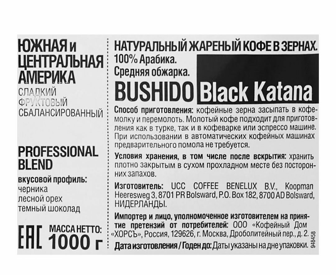 Купить Кофе Bushido Black Katana, зерновой, средняя обжарка, арабика, 2 шт по 1 кг с доставкой по всей России.