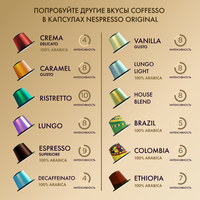 В состав ассорти входят вкусы: Classico Italiano х 5 капсул Crema Delicato х 5 капсул Ristretto х 5 капсул Lungo х 5 капсул Vanilla х 5 капсул Caramel х 5 капсул