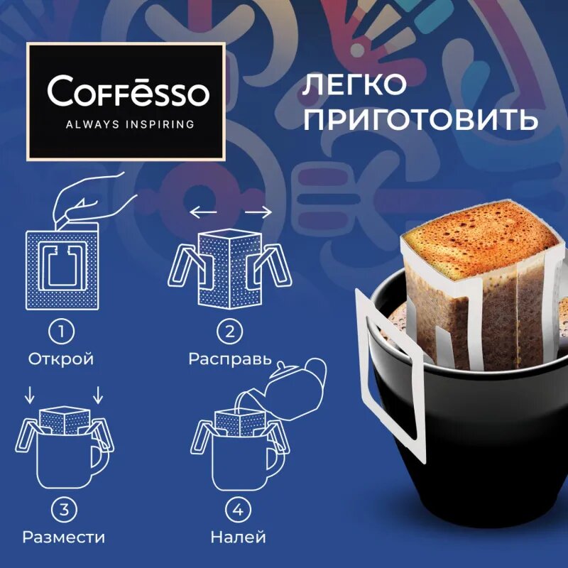 Кофе Coffesso Colombia Tinto отличается простотой в приготовлении. Достаточно открыть пакет, установить его на чашку, залить горячей водой, и ваш напиток готов. Такой подход позволяет наслаждаться свежезаваренным кофе без лишних хлопот.