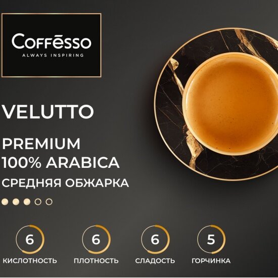 Кофе Coffesso VELUTTO состоит из 100% арабики, что гарантирует высокое качество и насыщенный вкус. Зерна подвергнуты средней обжарке, что позволяет раскрыть многогранный бленд с оттенками карамели, шоколада и цитруса.