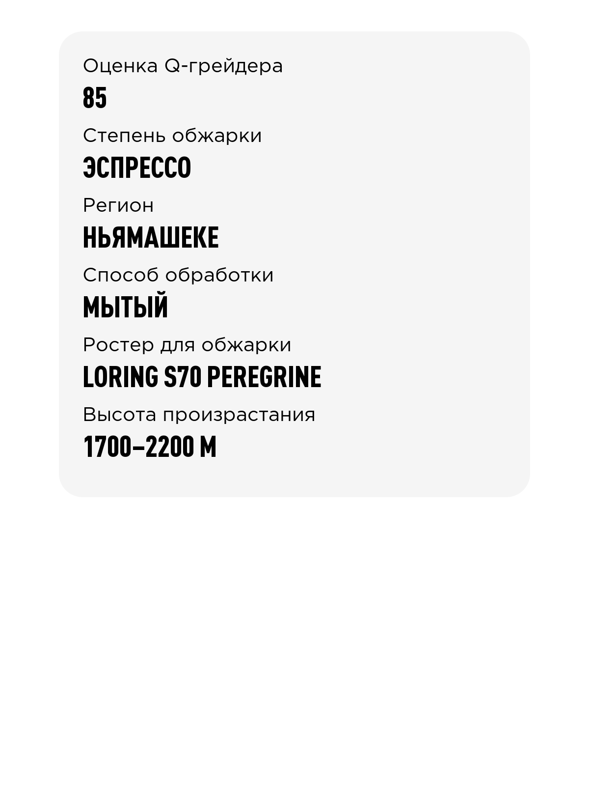Этот лот обработан мытым способом при котором ягоды после депульпации прошли сухую ферментацию в течение 18 часов, а затем их промыли от остатков мякоти и сушили на африканских кроватях в течение 10 дней.