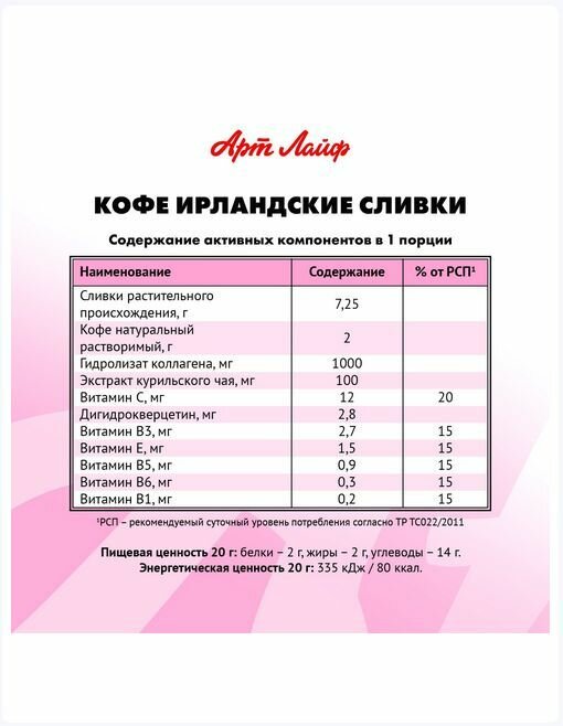 Купить Кофе «Ирландские сливки», обогащенный коллагеном и витаминами, 10 пак. Арт Лайф с доставкой по всей России. Кофе «Ирландские сливки», обогащенный коллагеном и витаминами, 10 пак. Арт Лайф: сравнение цен, характеристики, фото, актуальное наличие и цены.