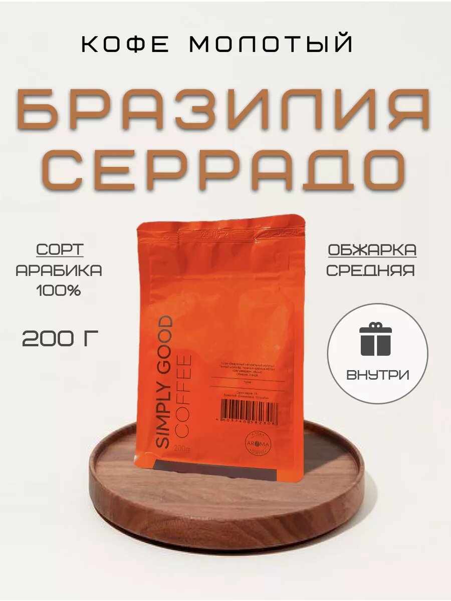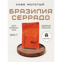 Кофе молотый Бразилия Серрадо 200 г – 100% бразильская арабика. Эта бюджетная южноамериканская арабика сухой обработки, средней обжарки. Кофейные зерна некрупные, цвета молочного шоколада с ярким ароматом.