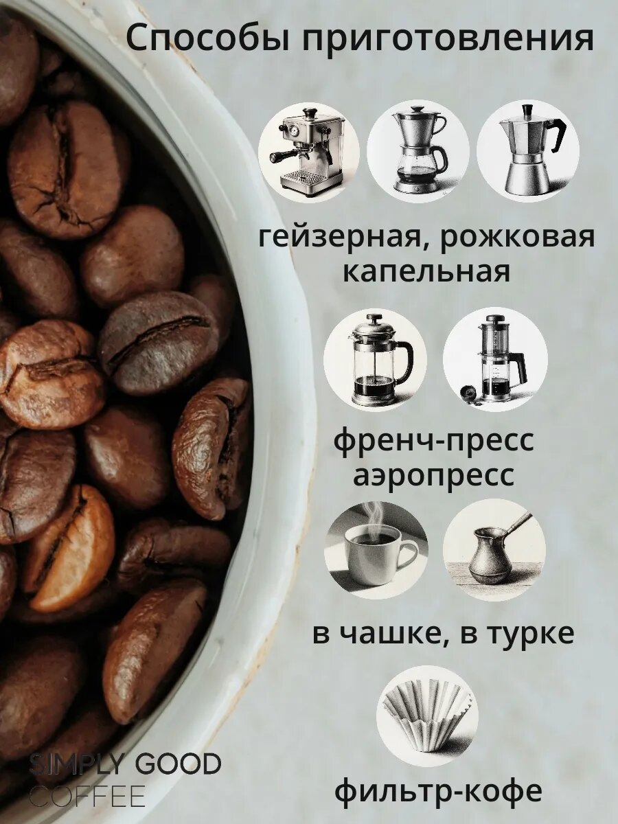 Способы приготовления. Подходящий вариант для приготовления фильтр-кофе, в гейзерной кофеварке и в кружке. Также раскрывается при приготовлении альтернативными способами: в пуровере, кемексе, френч-прессе, капельной кофеварке.