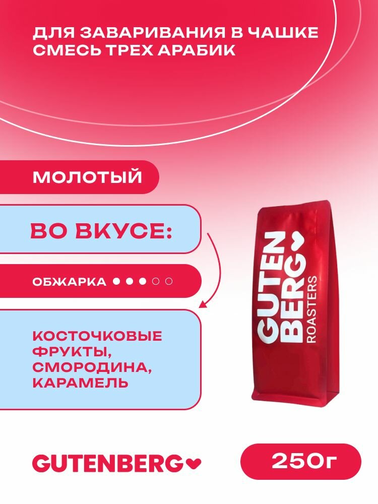 Купить Кофе молотый Gutenberg для заваривания в чашке смесь трех арабик 250 г. с доставкой по всей России. Кофе молотый Gutenberg для заваривания в чашке смесь трех арабик 250 г.: сравнение цен, характеристики, фото, актуальное наличие и цены.