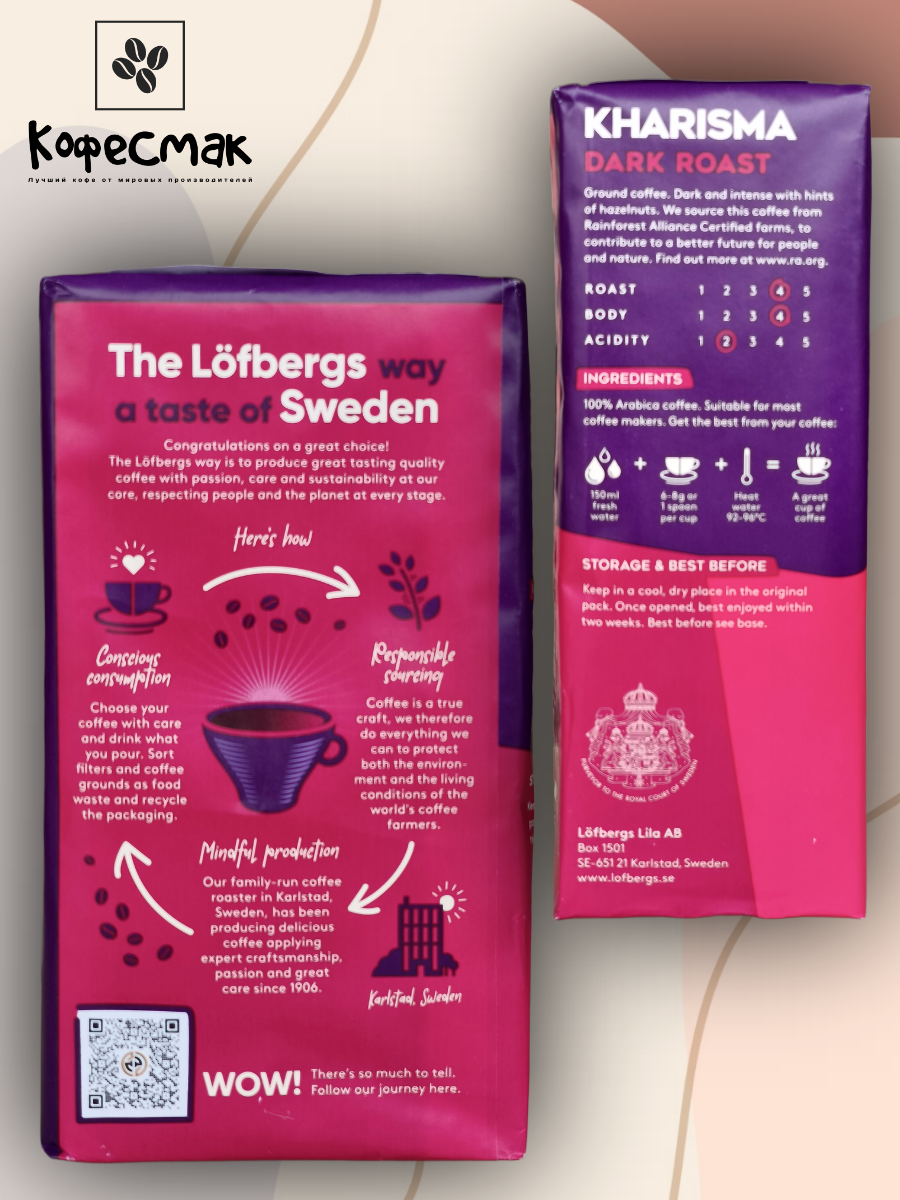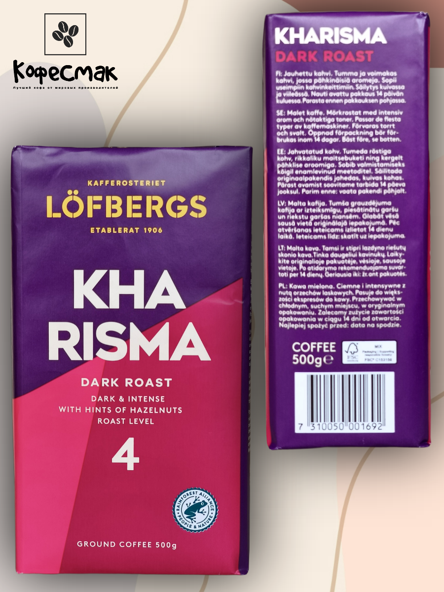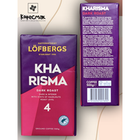 Заварной, ароматный шведский кофе LOFBERGS номер 4 с нотками орехового послевкусия тёмная обжарка, крепость чуть выше средней. Кофе молотый Lofbergs Kharisma, натуральный, деликатной темной обжарки из отборных зерен высокогорной 100% арабики из Бразилии, Колумбии, Южной и Центральной Америки, и Восточной Африки.