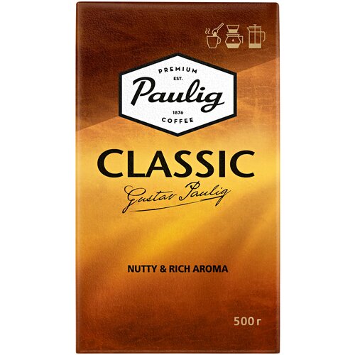 Кофе Paulig Classic молотый 500г 1 шт. Кофе молотый Paulig Classic 500 г - это кофе для лучшего начала дня. Восхитительная смесь натурального молотого кофе средней обжарки с благородным продолжительным послевкусием и аппетитным кофейным ароматом. Отборные сорта. придают ему изумительный букет, а гватемальский кофе, выросший на вулканической почве дарит завершенность и оригинальность. Эксперты в создании кофейных смесей разработали этот продукт на основе тщательных исследований потребительских предпочтений стран Балтии, России и Украины. Это именно тот кофе, который придется по нраву большинству его обожателей. Вакуумный пакет золотисто-коричневого цвета в форме кирпичика всегда аккуратно располагается в шкафчике домашней кухни или офисного помещения, и отлично справляется с сохранением свежести и аромата молотого кофе. Приготовить кофе молотый Paulig Classic можно в кофеварке, турке или просто заварив его в чашке. Каждый вариант внесет нотку разнообразия в привычный вариант. Состав: смесь арабики и робусты. Степень обжарки: средняя. Вид кофе: молотый. Степень помола: средняя. Способ приготовления: приготовить в кофеварке, турке или заварить в чашке. Вес: 500 г. Тип упаковки: вакуумный пакет. Условия хранения: плотно закрытый пакет хранить в сухом прохладном месте. Страна производства: Россия. ГОСТ 32775