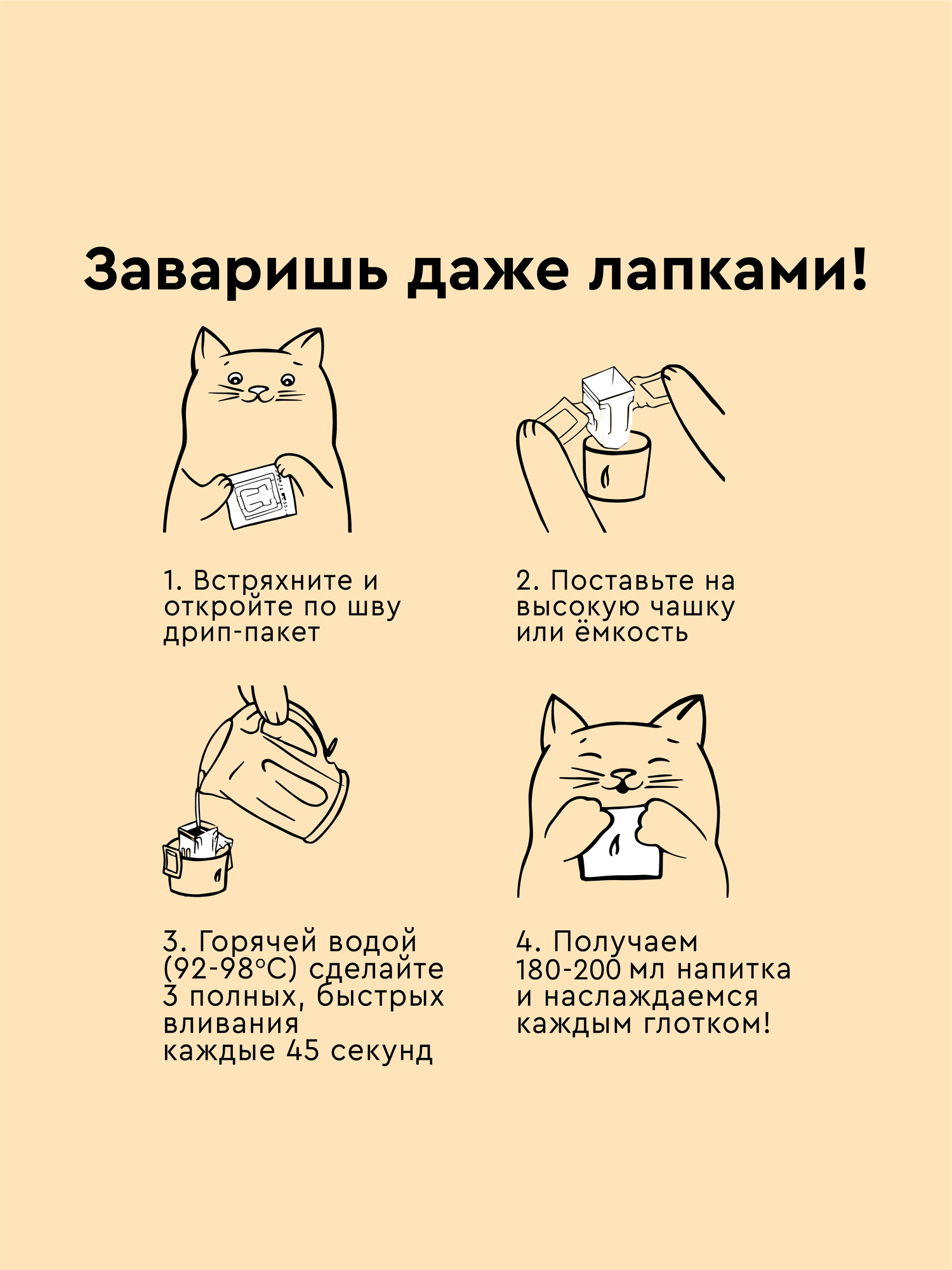 Встряхните дрип-пакет и аккуратно откройте его по линии срыва. Расправьте боковые ручки и установите дрип на высокий стакан, чашку, емкость или стеклянный сервер. Лучше заваривать дрип-пакет на высокой посуде. Горячей водой (92-98С) сделать три полных вливания до края дрип-пакета каждые 45 секунд: ・1 вливание в 0 секунд до края дрип-пакета; ・2 вливание в 45 секунд до края дрип-пакета; ・3 вливание в 1 минуту 30 секунд до края дрип-пакета; Общий выход напитка получится 190-210 мл, а общее время заваривания от 2 минут до 3 минут; Аккуратно снимете фильтр со стакана, чашки и тд. Отлично, кофе готов!