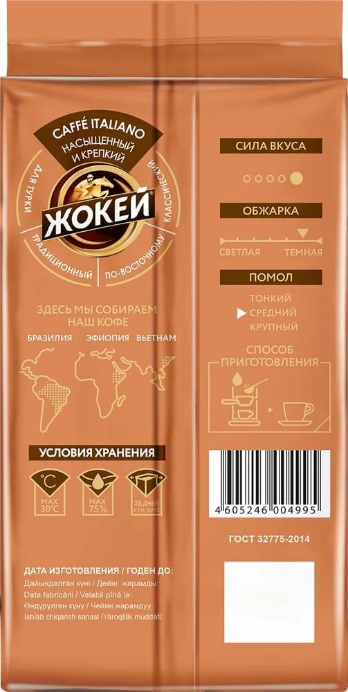 Сложный бленд лучших сортов арабики из Бразилии, Вьетнама, Эфиопии. Кофе, созданный в итальянской традиции, обладает идеально сбалансированным вкусом, ярким и насыщенным ароматом. Точная кофейная композиция, темная итальянская обжарка и особый помол делают Жокей Кафе Итальяно идеальным для любого способа приготовления.
