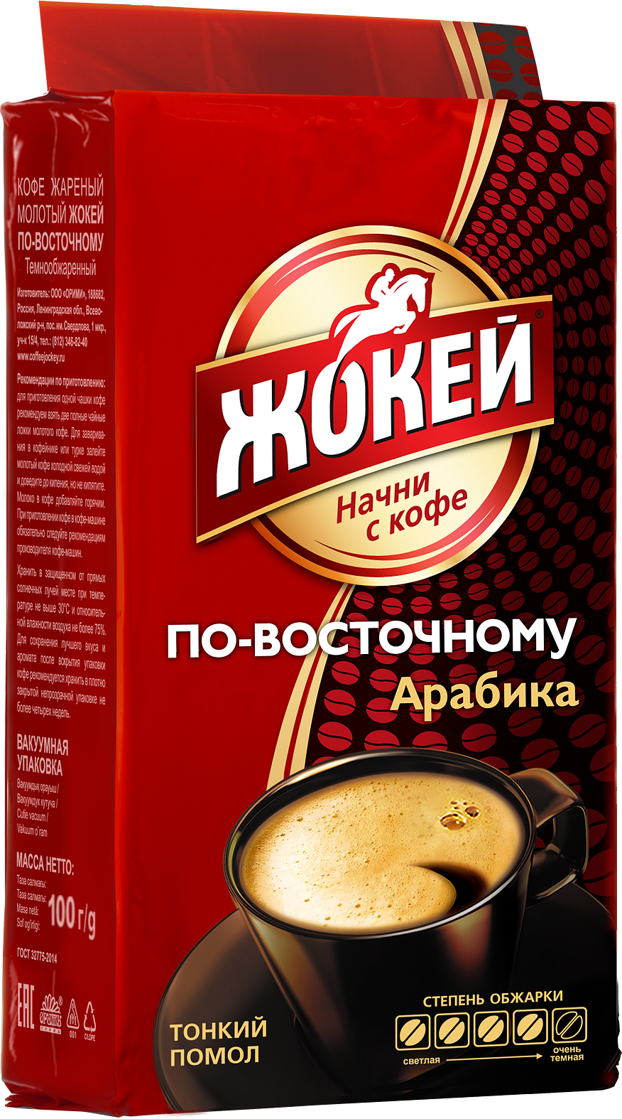 Кофе молотый Жокей По-восточному создан из отменной арабики, собранной с плантаций Центральной и Южной Америки, Африки и Индии. Для наиболее полного раскрытия вкуса используется интенсивная обжарка кофейных зерен, которые впоследствии тонко перемалываются. Чашка свежеприготовленного напитка подарит вам неповторимый вкус и удивительный аромат. Крепкий, но в то же время мягкий, густой и насыщенный кофе подарит вам лучшие моменты, наполненные яркостью, бодростью и теплом. Жокей По-восточному станет оптимальным вариантом для использования в офисе, помогая поддерживать тонус, энергию и хорошее расположение духа. Это отличное угощение для гостей и клиентов, партнеров и товарищей. Любое совещание или переговоры будут гораздо продуктивнее, если разбавить их бодрящим напитком. Благодаря тонкому помолу вы сможете приготовить кофе даже при отсутствии кофеварки, заварив его прямо в чашке и дав настояться несколько минут.