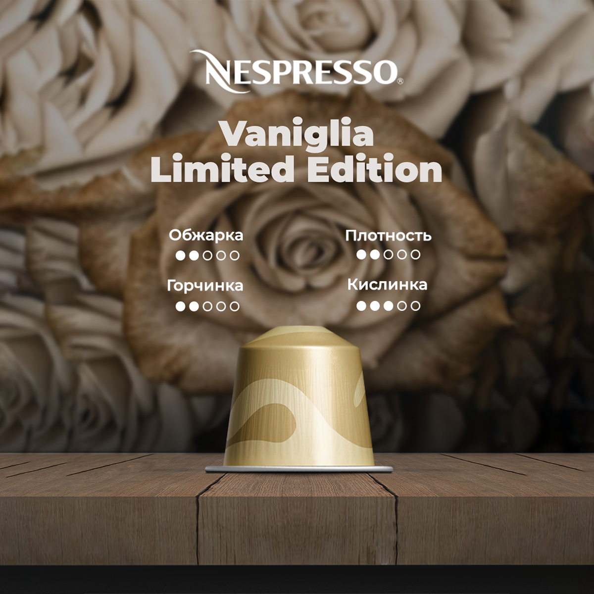 Кофе в капсулах Nespresso Vaniglia представляет собой изысканное сочетание кофе и классического вкуса ванили, которое способно вызвать прилив прекрасных воспоминаний.