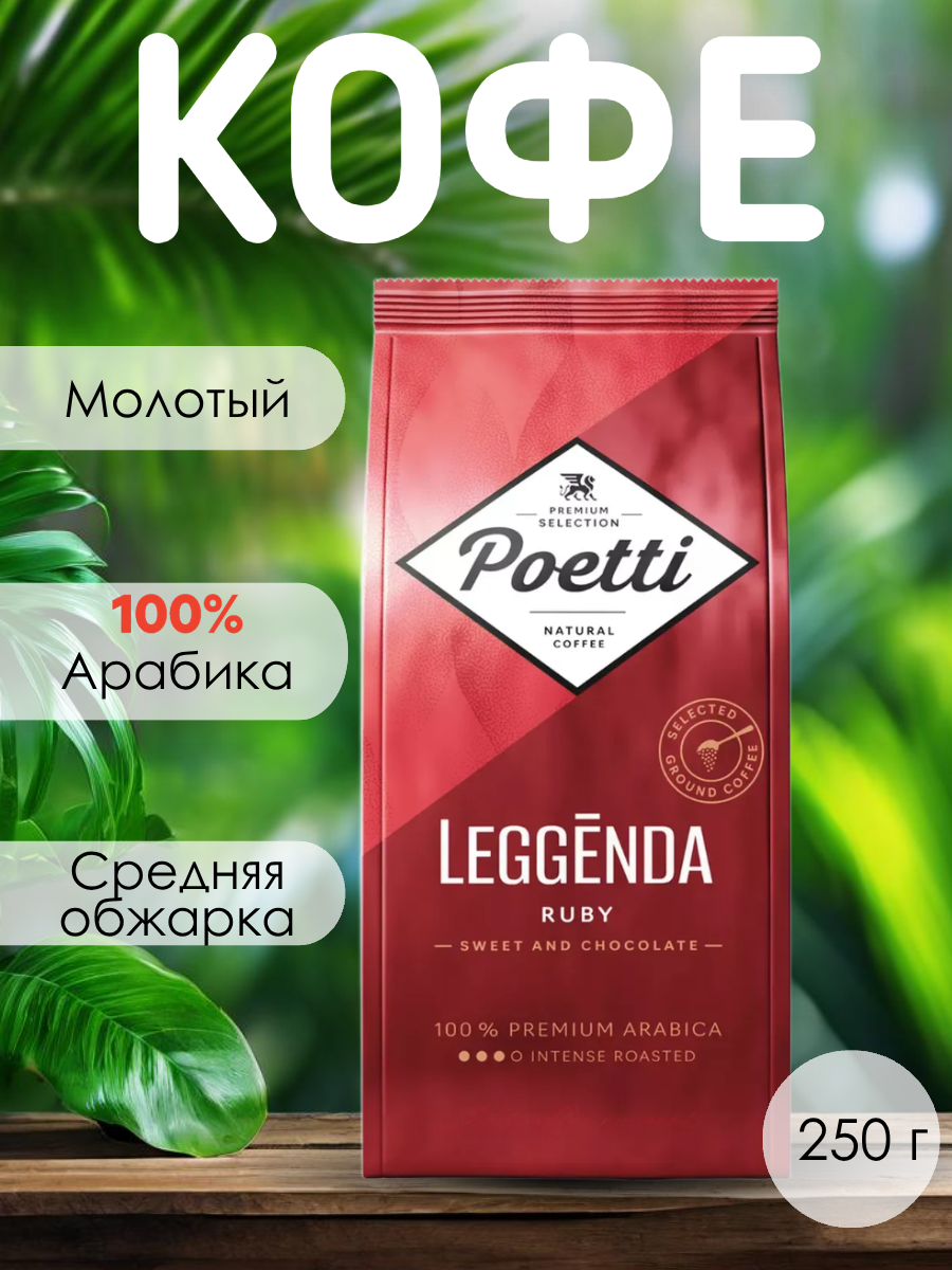 Кофе молотый Poetti Leggenda Ruby — это изысканный напиток, который подарит вам наслаждение от каждой чашки. Упаковка весом 250 г содержит 100% арабику, что гарантирует высокое качество и насыщенный вкус.