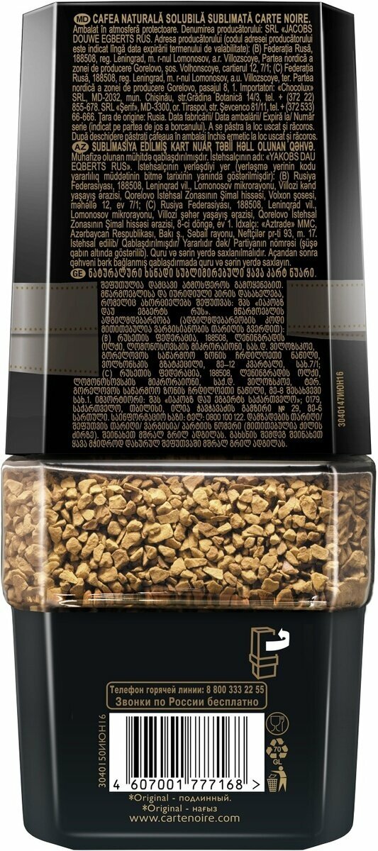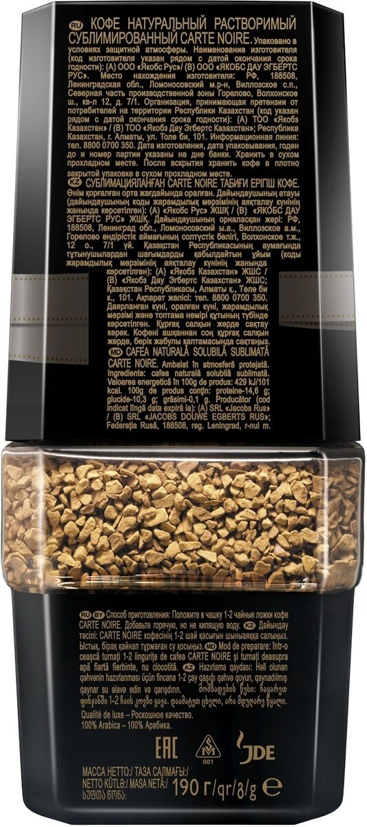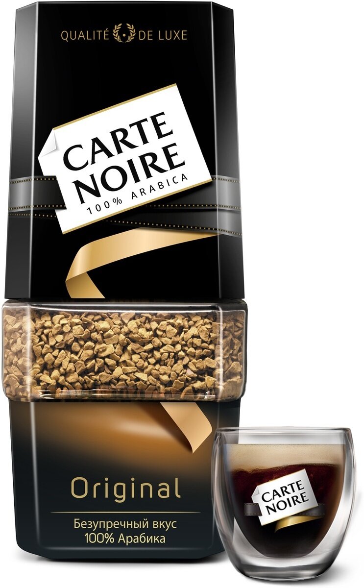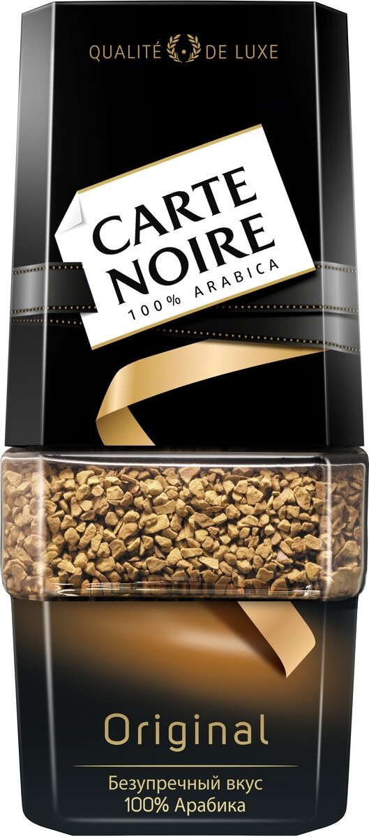 Кофе «Carte Noire» 190 г вероятно знаком всем, кто пьет кофе. Этот кофе стоит недорого, хоть и считается элитным, и имеет свой неповторимый и узнаваемый вкус. Растворимый кофе Carte Noire Original имеет достаточно крепкий, яркий и насыщенный вкус 100% арабики, которая произрастает в Азии и Латинской Америке. Средняя обжарка делает напиток не слишком горьким, и при этом хорошо раскрывается аромат. Вкус кофе насыщенный, интенсивный, с яркими цитрусовыми нотками, присущими Арабике. Секрет обжарки кроется в особой технологии, именуемой «Огонь и Лед». Сперва зерна подвергаются нагреванию до определенной температуры и в определенный момент их мгновенно охлаждают. Это необходимо для того, чтобы сохранить аромат зерен и раскрыть как можно больше различных вкусовых оттенков. «Карт нуар» (в переводе — «чёрная карта») производит компания Jacobs Douwe Egberts (JDE), завод который находится в Ленинградской области, и там производятся и другие продукты для российского рынка, принадлежащие JDE: например, Jacobs, Tassimo, Maxim, Maxwell House и т. д. Carte Noire создал французский гурман и авторитетный во Франции эксперт в мире кофе Rene Monnier. Идея собственного бренда появилась у него в 1965 году, и первый свой купаж мастер назвал Grand-Mere (в переводе на русский — «бабушка»). Слоган, звучавший во время рекламной кампании: «Бабушка, приготовь нам ароматный кофе!» вызывал улыбку, быстро запомнился и немало способствовал популярности новой торговой марки. А в 1978 году Rene Monnier презентовал «карточную» коллекцию — Carte Rouge («красная карта»), Carte Bleu («голубая карта») и сразу ставший фаворитом Carte Noire. Успех бренда был предсказуемым: собранные, обработанные и обжаренные вручную зёрна арабики с элитных плантаций (Arabica Exclusif) обладали невероятным ароматом, насыщенным многогранным вкусом с целым букетом оттенков и приятным длительным послевкусием с характерной для бодрящих напитков горчинкой. Первая партия напитка, несмотря на высокую цену, разошлась в считанные дни, в чём немалую роль сыграла и запоминающаяся упаковка. Интригующе-чёрный пакет с прозрачной полоской, сквозь которую были видны зёрна, и обвивающей золотой лентой, название марки и образ в целом придумал известный французский имиджмейкер Jacques Segal, которого называли — «тот, что создаёт королей». Такое прозвище Жак Сегал получил благодаря успешно реализованным проектам по созданию имиджа в рекламных кампаниях президентов — Франсуа Миттерана, Александра Квасневского, Йожефа Анталла. Carte Noire открыл новую страницу кофейной классификации, благодаря ему появился новый стандарт качества — Premium Arabica. Банка кофе выглядит презентабельно, благодаря своей уникальной форме и дизайну, поэтому растворимый кофе arabica Карт Нуар идеально подойдет в качестве подарка на любой праздник. Большую популярность в России получил Карт Нуар в растворимом виде, поскольку бешеный ритм жизни диктует свои условия.