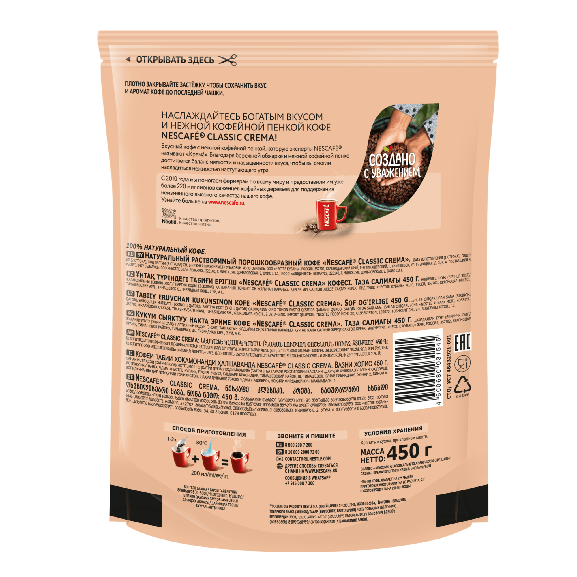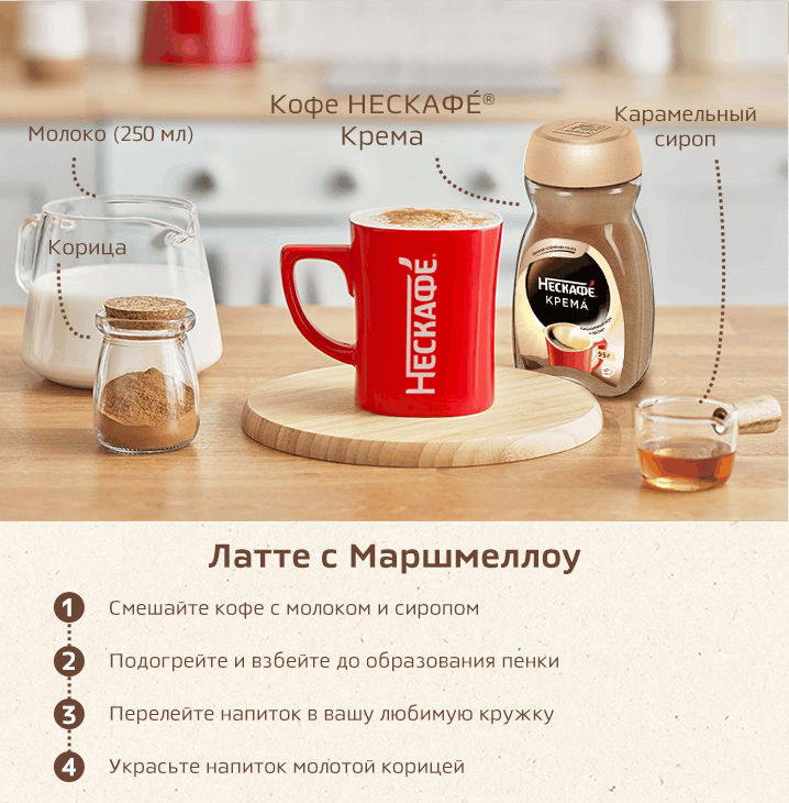Чтобы насладиться чашкой ароматного кофе : Шаг 1. Добавьте 2 чайной ложки кофе NESCAFÉ Classic Crema в чашку; Шаг 2. Залейте горячей, но не кипящей водой; Шаг 3. По желанию можно добавить сахар, молоко или сливки. Вы можете приготовить с NESCAFÉ Classic Crema разнообразные вариации кофейных напитков: • Латте; • Капучино; • Мокка.