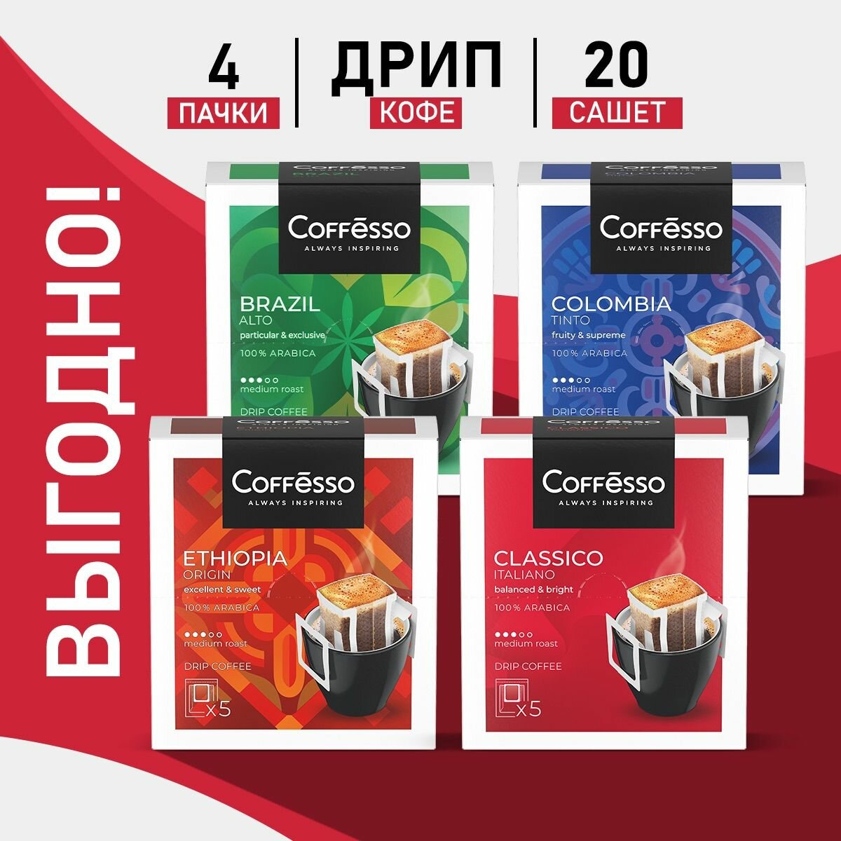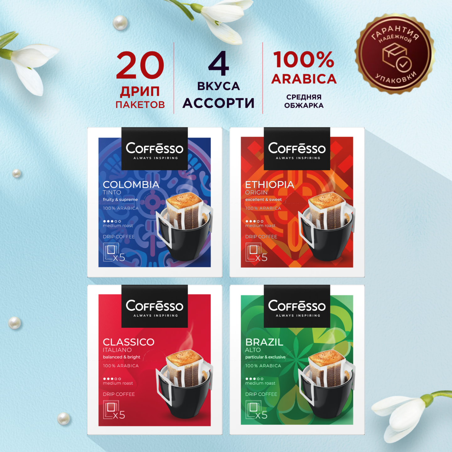 Купить Кофе в дрип-пакетах Coffesso Brazil, Colombia, Ethiopia, Italiano 4 уп х 5 саш с доставкой по всей России.