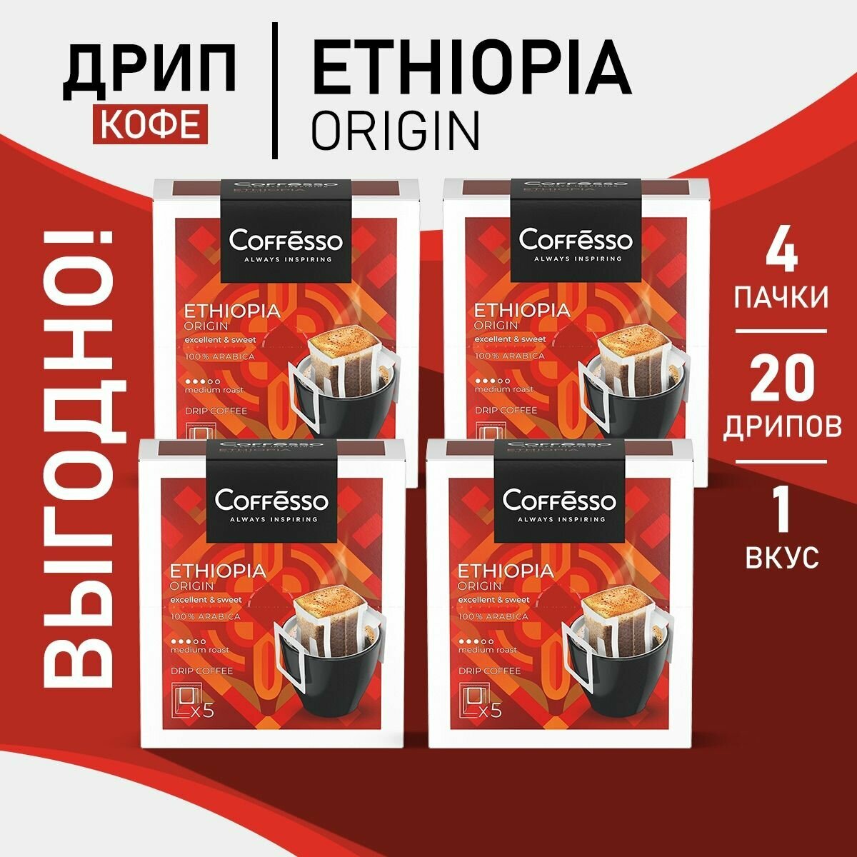 Купить Кофе в дрип-пакетах Coffesso Ethiopia набор 4 упаковки х 5 саш с доставкой по всей России. Кофе в дрип-пакетах Coffesso Ethiopia набор 4 упаковки х 5 саш: сравнение цен, характеристики, фото, актуальное наличие и цены.