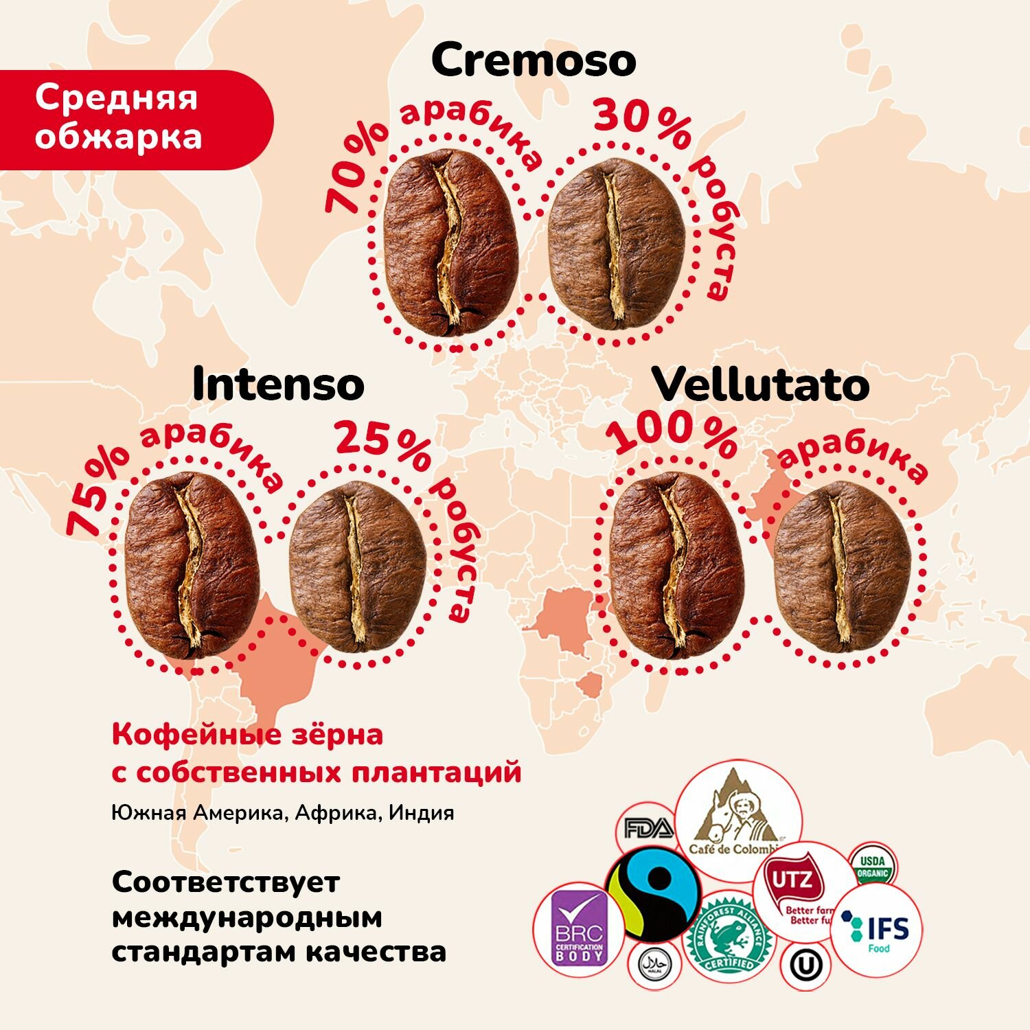 - Состав Кремозо: Смесь 70% арабики и 30% робусты.