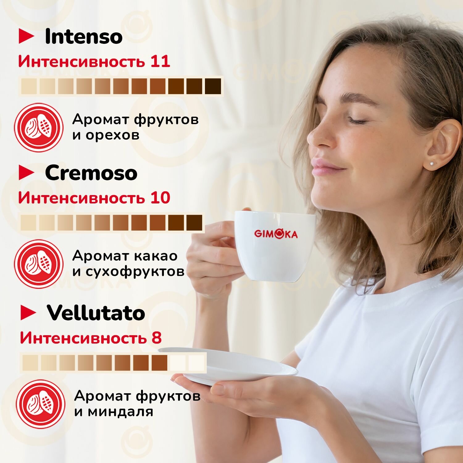 - Gimoka Intenso характеризуется крепким и стойким вкусом. Ощутите ореховый аромат с оттенками фруктов. Послевкусие ярко выраженное и стойкое.