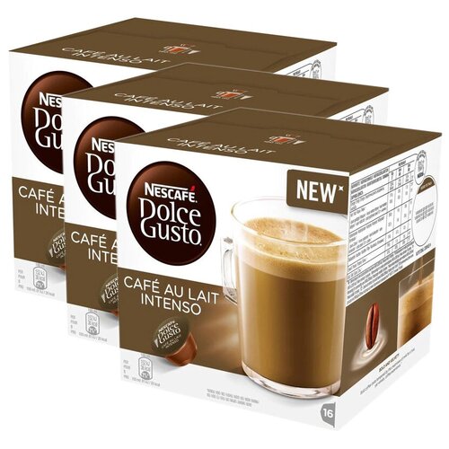 Спайка трех упаковок содержит 48 капсул - по 16 штук, предназначенных для капсульных кофемашин NESCAFE® Dolce Gusto®. Насладитесь 48 ароматными чашками Cafe Au Lait Intenso, что с французского переводится как «кофе с молоком»!
