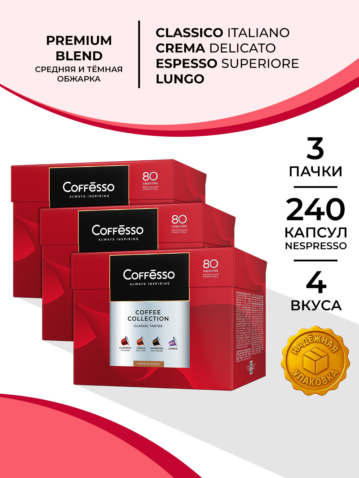 Купить Кофе в капсулах nespresso Coffesso «гранд ассорти 4 вкуса», 3 упаковки по 80 капсул с доставкой по всей России. Кофе в капсулах nespresso Coffesso «гранд ассорти 4 вкуса», 3 упаковки по 80 капсул: сравнение цен, характеристики, фото, актуальное наличие и цены.