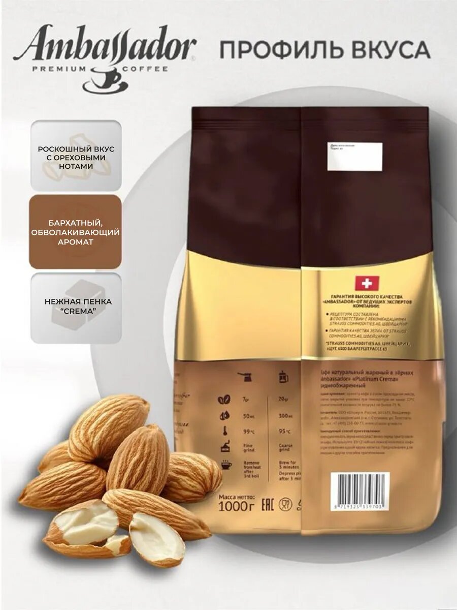 Кофе в зернах «Ambassador Crema Platinum», 1 кг, средняя обжарка, ореховый вкус: сравнение цен, характеристики, фото, актуальное наличие и цены.