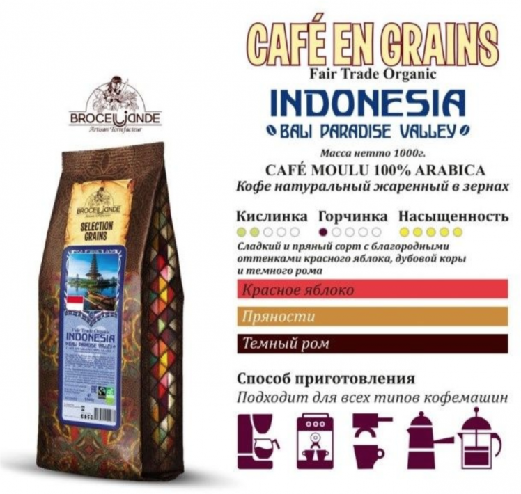 Не забывайте, что наш продукт - это не кофе в пакетиках 3 в 1, а намного лучше - натуральней и полезней, не такой известный как Lavazza или бушидо, но зато 100% арабика из лучших плантаций. Кофе в зернах Brocelliande - это продукты из франции. Если вы хотите насладиться идеальным завариванием кофе, то выбирайте Brocelliande Indonesia , и вы почувствуете бодрость и энергию на весь день. Brocelliande кофе в зернах арабика для турки и кофе для рожковой кофеварки, можно использовать, если перемолоть в кофемолке.