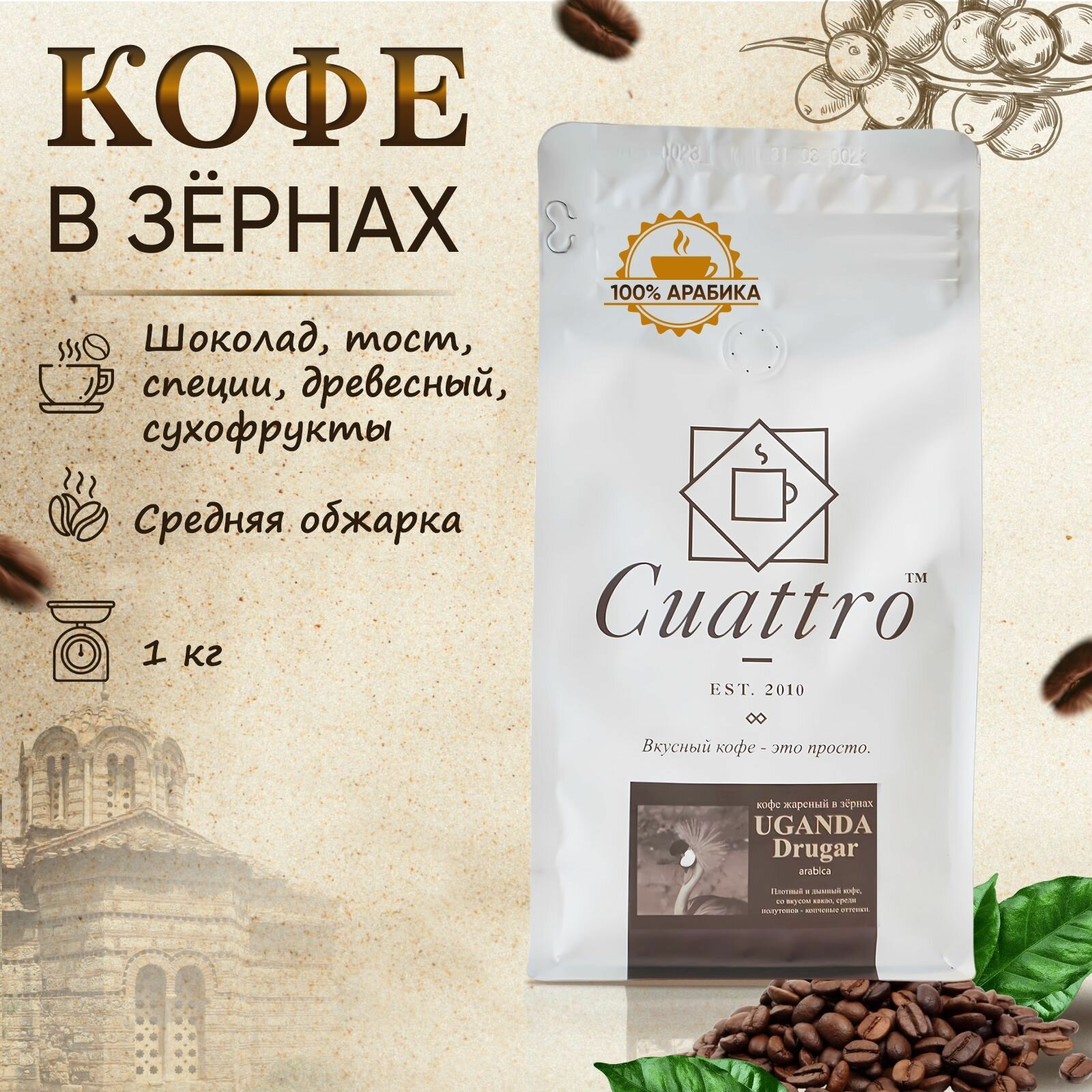 Кофе в зернах CUATTRO Уганда Другар - это отличный выбор для настоящих ценителей. Упаковка весом 1 кг содержит 100% арабику, что обеспечивает насыщенный и глубокий вкус. Средняя обжарка позволяет раскрыть все тонкости аромата, делая напиток мягким и легко усваиваемым. Этот зерновой кофе идеально подойдёт как для утреннего пробуждения, так и для спокойного вечера. Кофе из Уганды славится своим уникальным профилем вкуса, который сочетает в себе нотки фруктов и шоколада, создавая гармоничный коктейль ароматов. Каждая чашка кофе станет незабываемым опытом, позволяя вам погрузиться в мир настоящего удовольствия. CUATTRO Уганда Другар - это не просто кофе, а настоящая история, заключенная в зернах. Откройте для себя этот удивительный напиток и насладитесь каждым глотком, полным богатства и разнообразия.