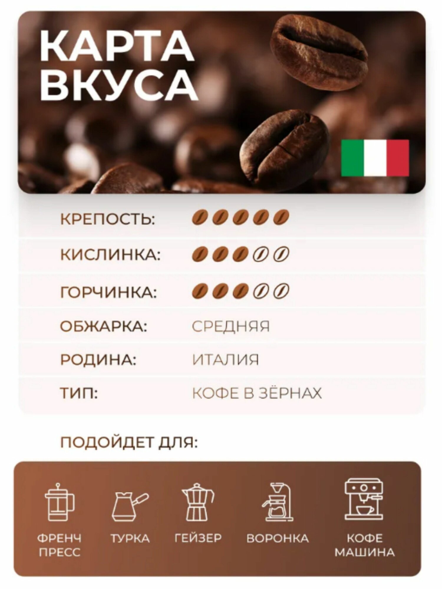 | Страна происхождения зерен кофе | Бразилия, Италия |