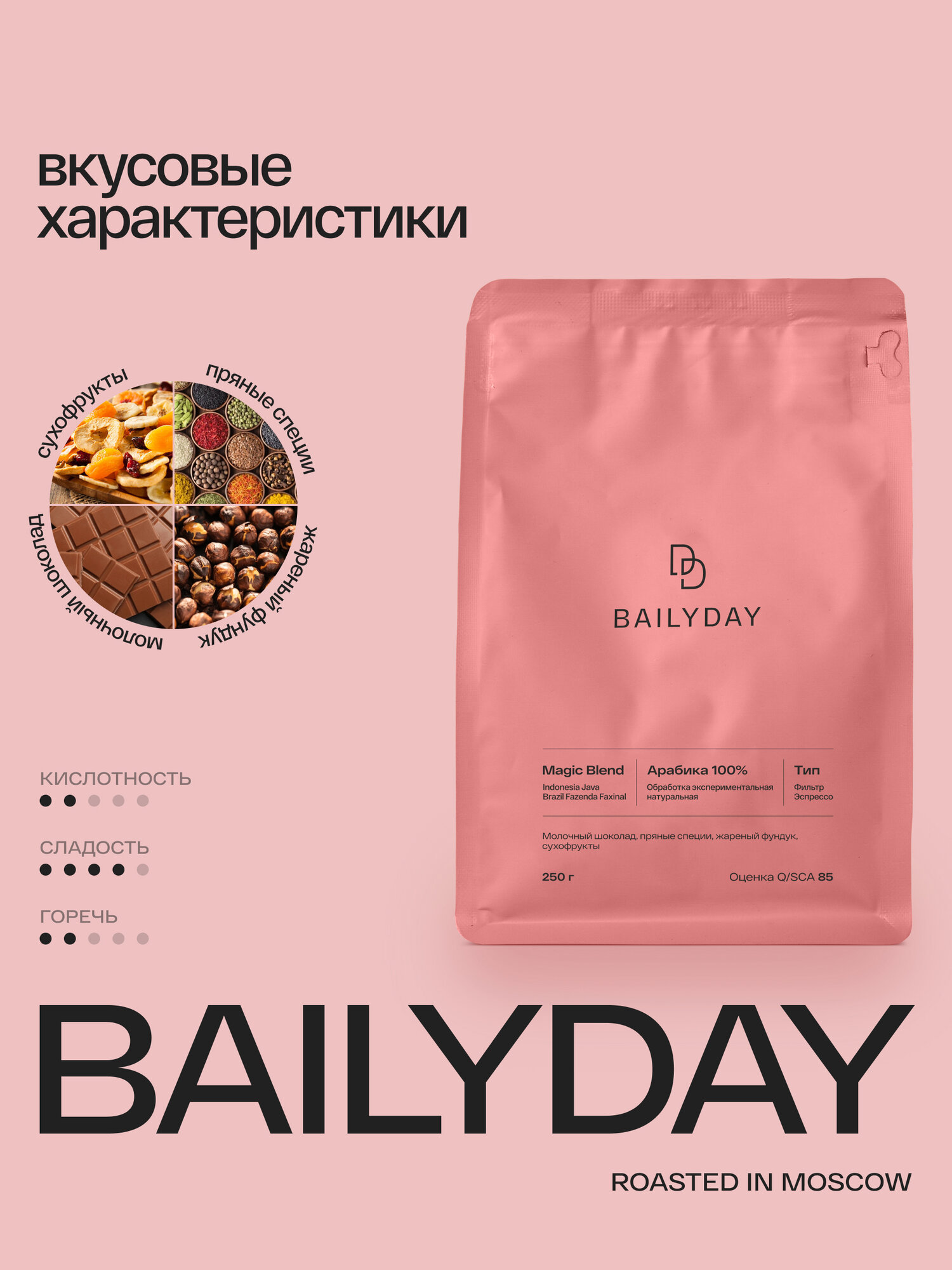 Magic Blend Bailyday — новогодний specialty-кофе в зернах 250 г с универсальной обжаркой (омни), которая одинаково хорошо подходит для кофемашины, фильтра, турки, гейзерной кофеварки и френч-пресса. В составе — Indonesia Java и Brazil Fazenda Faxinal. Обработка: экспериментальная/натуральная. Оценка Q/SCA — 85.
