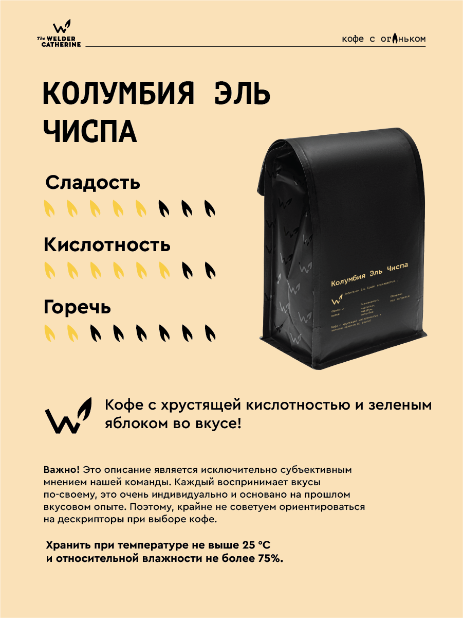 Кофе в зернах Сварщица Екатерина «Колумбия Эль Чиспа под эспрессо» — 1 кг: сравнение цен, характеристики, фото, актуальное наличие и цены.