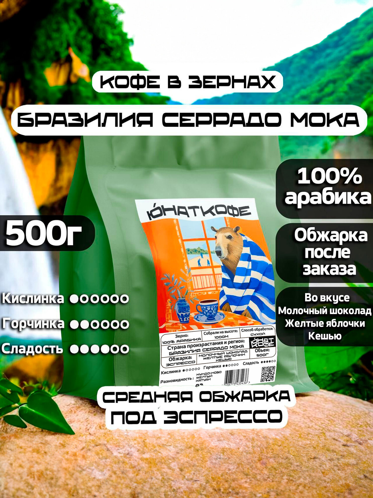 Кофе в зернах Юнат Кофе Бразилия Серрадо Мока Пиберри, 100% арабика, обжарим перед отправкой, 500гр, средняя обжарка: сравнение цен, характеристики, фото, актуальное наличие и цены.