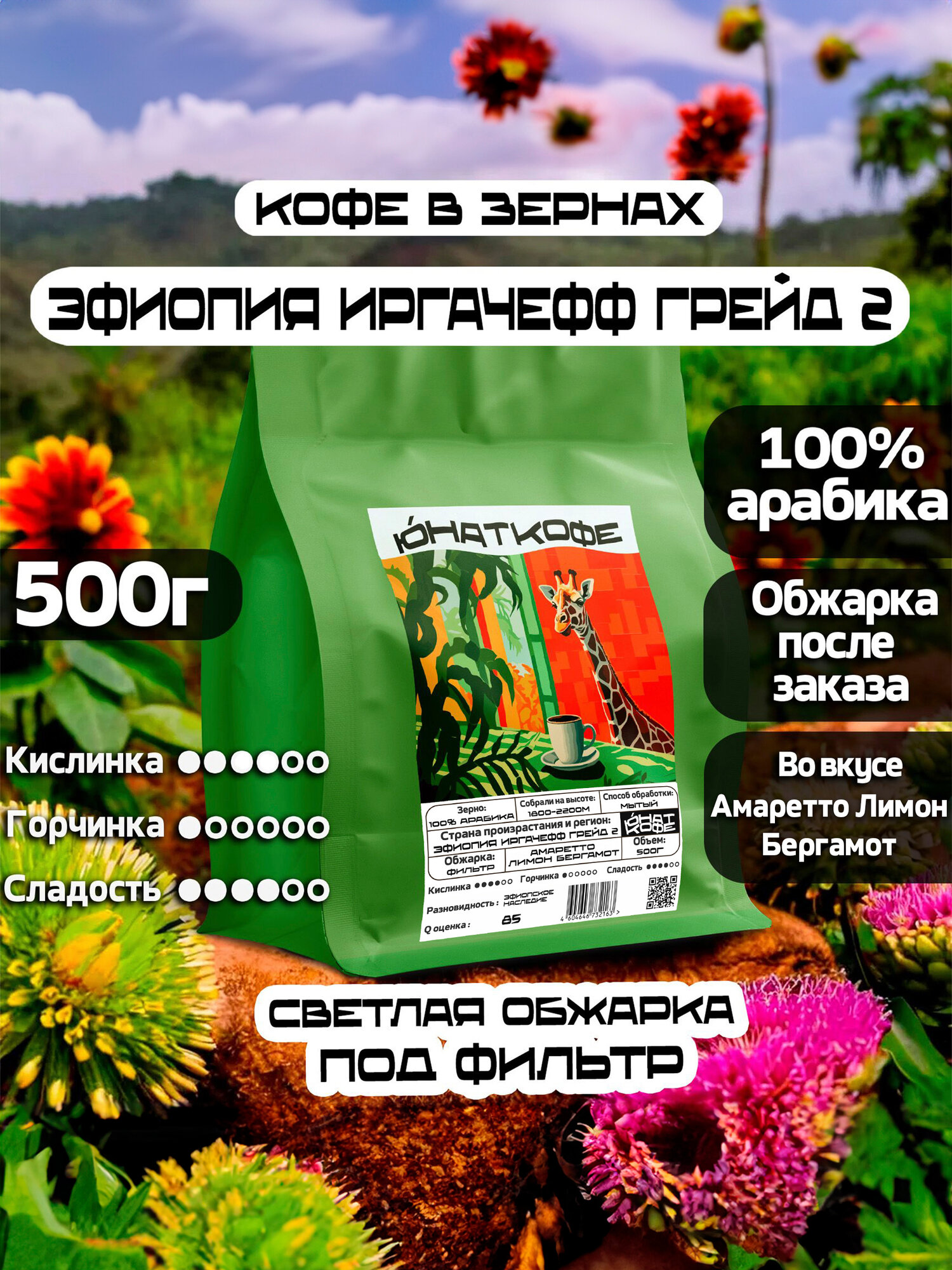 Кофе в зернах Юнат Кофе Эфиопия Иргачефф, 100% арабика, обжарим перед отправкой, 500гр, светлая обжарка