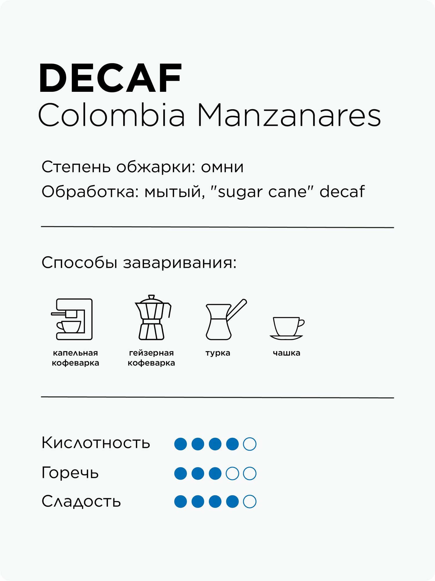 Питкий кофе с чайным телом, высокой сладостью, нотами красного яблока, лимонного кекса и гречишного чая во вкусе. Кофе без кофеина для всех способов заваривания.