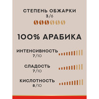 Характеристики бленда: Состав – 100% арабика Страна производства – Италия Сбалансированный аромат со сладкими фруктовыми нотами. Средняя степень обжаривания гарантирует сбалансированный вкус без горечи и кислоты. Интенсивность – 7/10 Кислотность – 8/10 Сладость – 7/10 Рекомендованный способ приготовления – автоматическая кофемашина, однако после помола также отлично подойдет для приготовления кофе в воронке, фильтр-кофеварке, рожковой кофеварке, турке или чашке. Помол следует подобрать, исходя из предпочитаемого Вами способа приготовления: Турка и чашка – тонкий (мелкий) Фильтр-кофеварка и рожковая кофеварка – средний Френч-пресс – грубый (крупный) Хранить открытый пакет следует в сухом прохладном месте при температуре от 5 до 25 градусов. Хранить кофе в холодильнике запрещено.