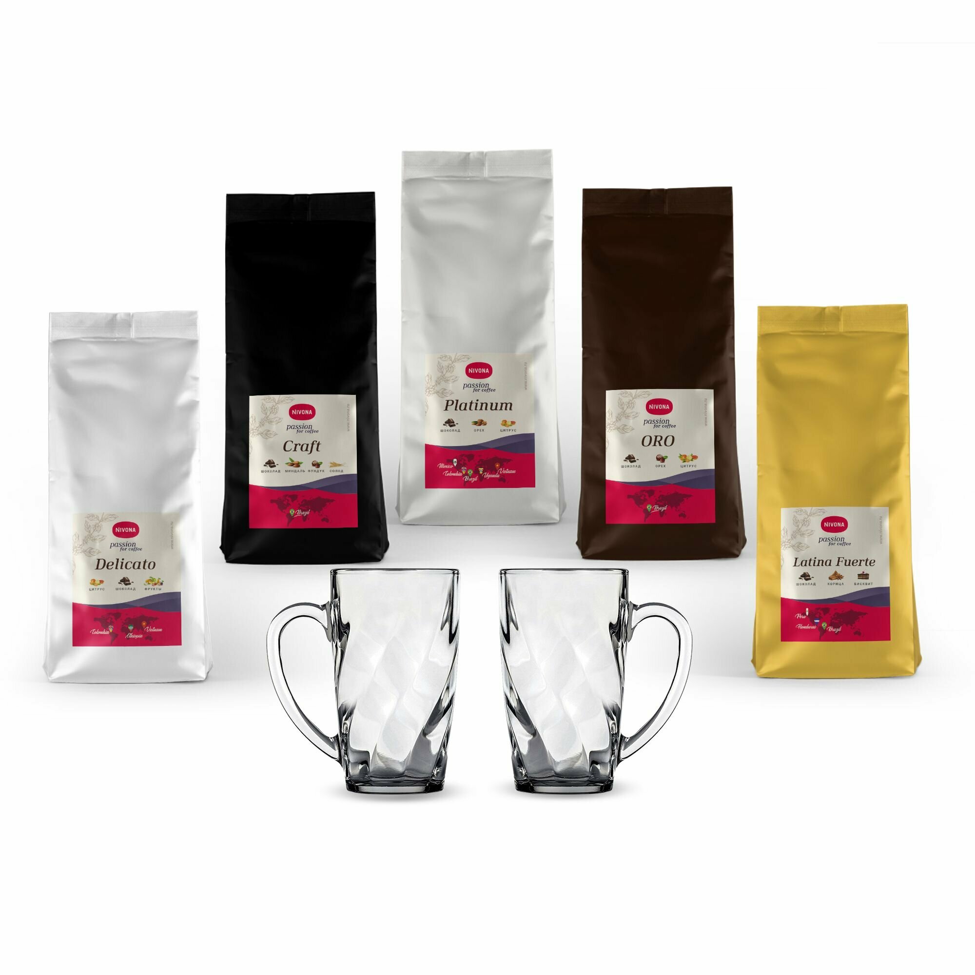 Набор из пяти сортов изысканного зернового кофе от Nivona и стеклянных кружек Мы специально собрали в один сет пять ярких блендов, чтобы Вы смогли почувствовать вкус и настроение каждого вида кофе с прекрасными цельными зернами, тщательно отобранными и с любовью обжаренными и еще добавили в него идеальные кружки из закаленного стекла для полного эстетического удовольствия: 1. Latina Fuerte, Зерновой кофе, состав - 100% арабика. Кофе с нотами сухофруктов, чернослива и жареного фундука. Плотный, интенсивный и очень сбалансированный вкус. Степень обжарки - средняя; 2. ORO, Зерновой кофе, состав - 100% арабика. Кофе с нотами горького шоколада, орехов, минимальной цитрусовой кислотностью и легкой перечной остротой. Степень обжарки - средняя; 3. CRAFT, Зерновой кофе, состав - 100% арабика. В аромате можно услышать сладкую выпечку и бисквит. Сладкий и округлый кофе с нотами сухофруктов, чернослива и жареного фундука. Плотный, интенсивный и очень сбалансированный вкус. Насладитесь насыщенным кофе темной обжарки с глубоким ярким вкусом; 4. Delicato, Зерновой кофе, состав - 55% арабика, 45% робуста. Кофе с утонченным вкусом, включающим цитрусовые, фруктовые нотки и обладающий шоколадным послевкусием. Степень обжарки - венская; 5. Platinum, Зерновой кофе, состав - 85% арабика, 15% робуста. Кофе с нотами грецкого ореха, жареного миндаля, тёмного шоколада и карамельным послевкусием. Степень обжарки – средняя; 6. Две стеклянные кружки с красивым дизайном, объем 360 мл, высота 13,5 см, диаметр 7,8 см. Изготовлены из термостойкого закаленного стекла по технологии Tempermax, обеспечивающей невероятную прочность, долговечность и термостойкость. Можно использовать в микроволновой печи и посудомоечной машине, выдерживают температуру от -20°C до +120°C.