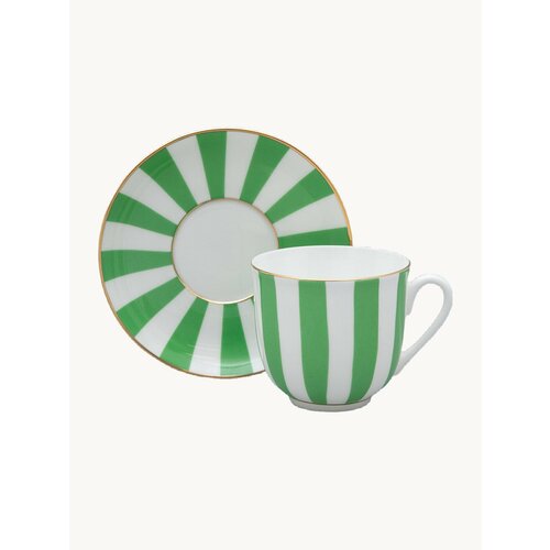 Чашка с блюдцем кофейная рис. "Да и Нет. Салатовый" на форме "Ландыш" изготовлена на Императорском фарфоровом заводе из костяного фарфора. Для декорирования используется надглазурная деколь, отводка золотом. Автор росписи - художник Императорского фарфорового завода Сергей Соколов, форма восстановлена по музейному образцу. Изделие впервые поступило в продажу в 2002 году. Роспись серии чашек «Да и нет» гениально проста: ритмичное чередование белых и цветных полос. Белый цвет – это цвет самого материала. Дополнительный тон выбран художником не случайно: он должен составлять с фарфоровым фоном гармоничный контраст и динамику.