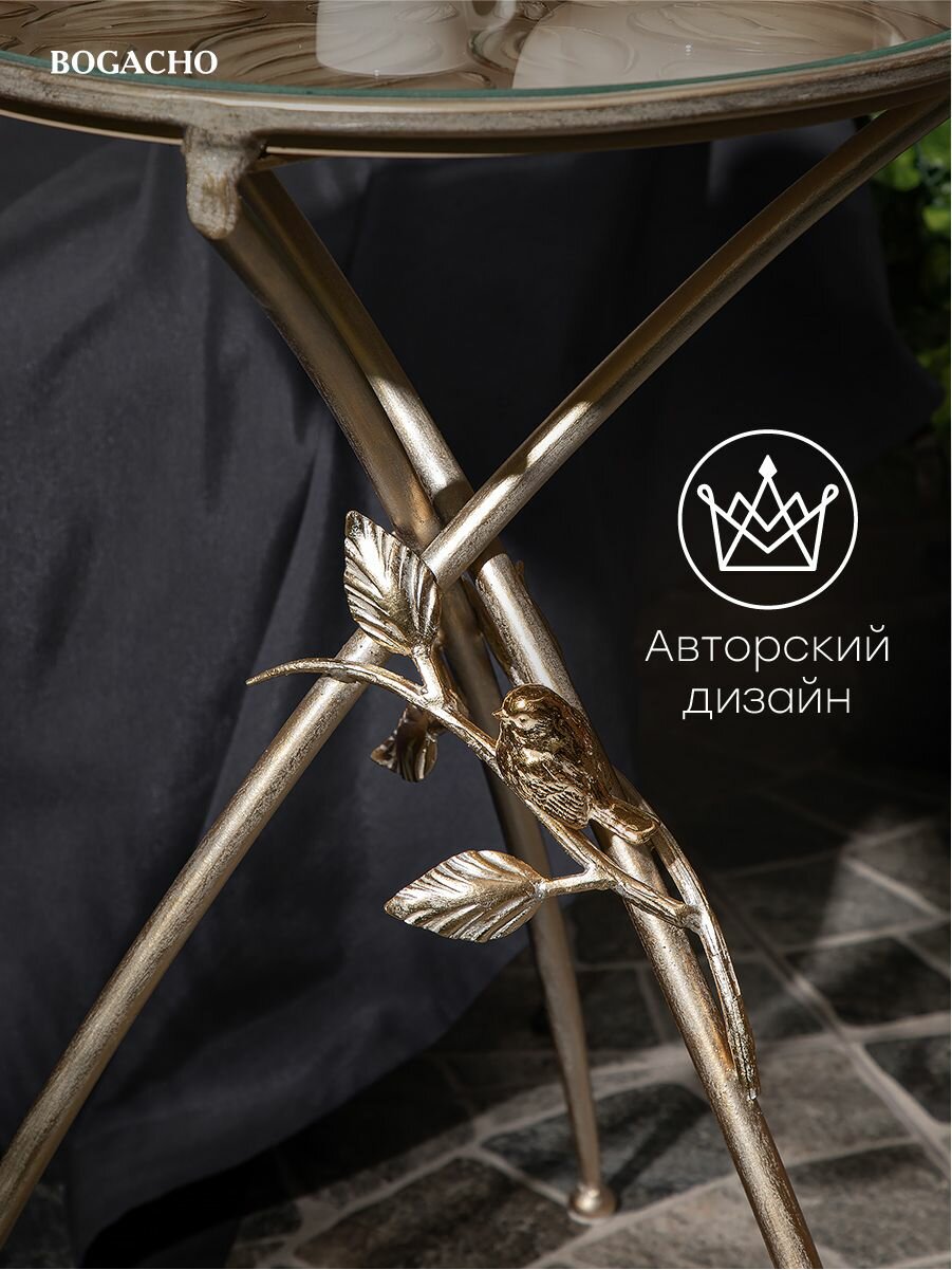 Купить Кофейный круглый столик Bogacho Зарнички Санфлауэр золотистый со стеклянной столешницей и коваными ножками с птичками с доставкой по всей России.