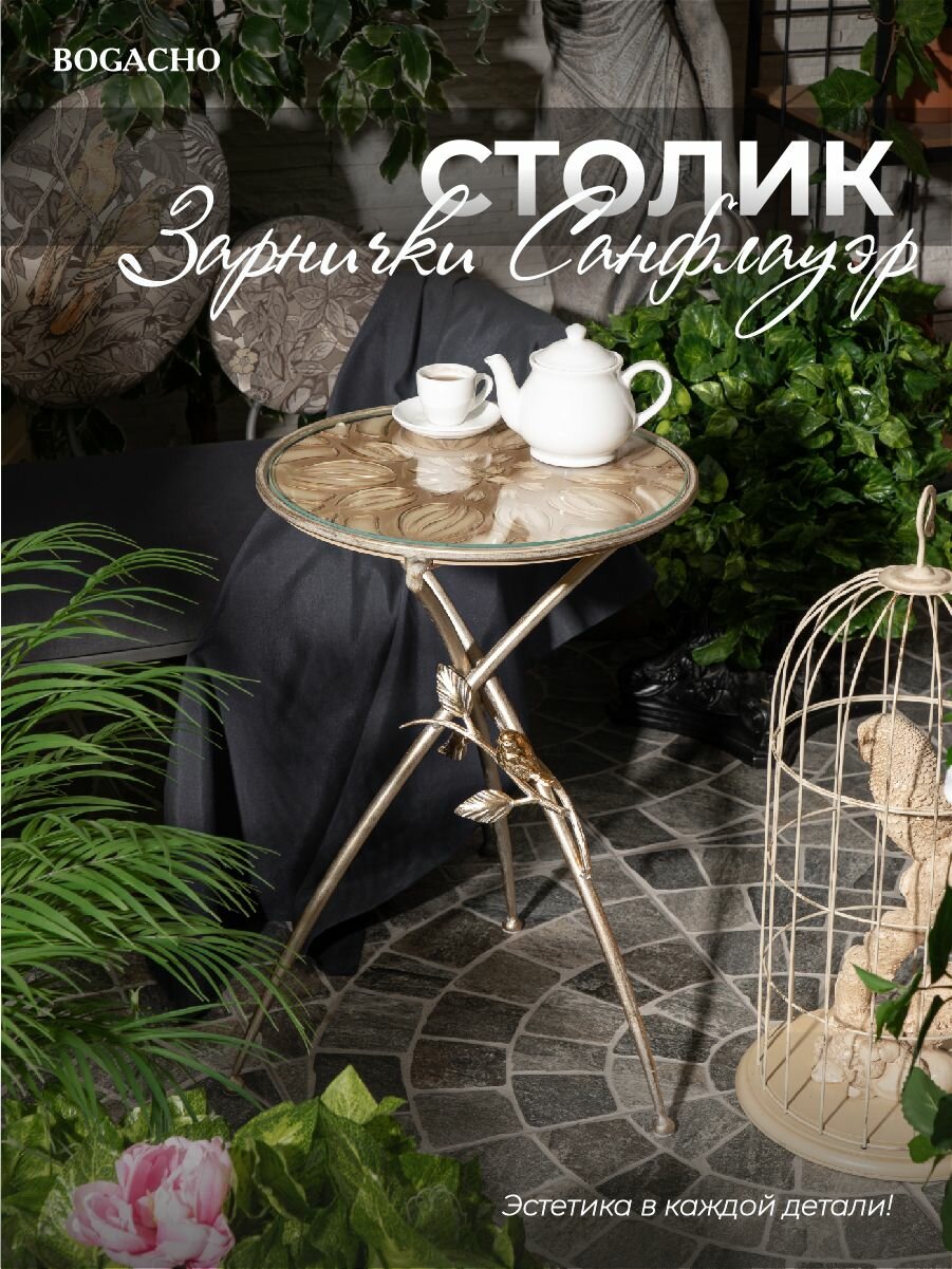 Кофейный круглый столик Bogacho Зарнички Санфлауэр золотистый со стеклянной столешницей и коваными ножками с птичками: сравнение цен, характеристики, фото, актуальное наличие и цены.