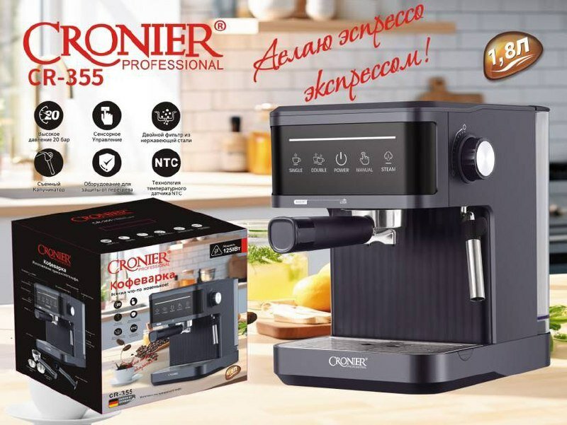 Кофемашина Cronier Professional CR-355, Кофеварка рожковая, Полуавтоматическая с капучинатором, Черный: сравнение цен, характеристики, фото, актуальное наличие и цены.
