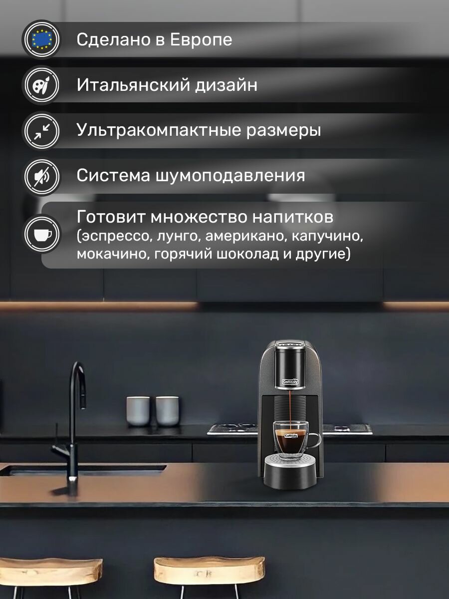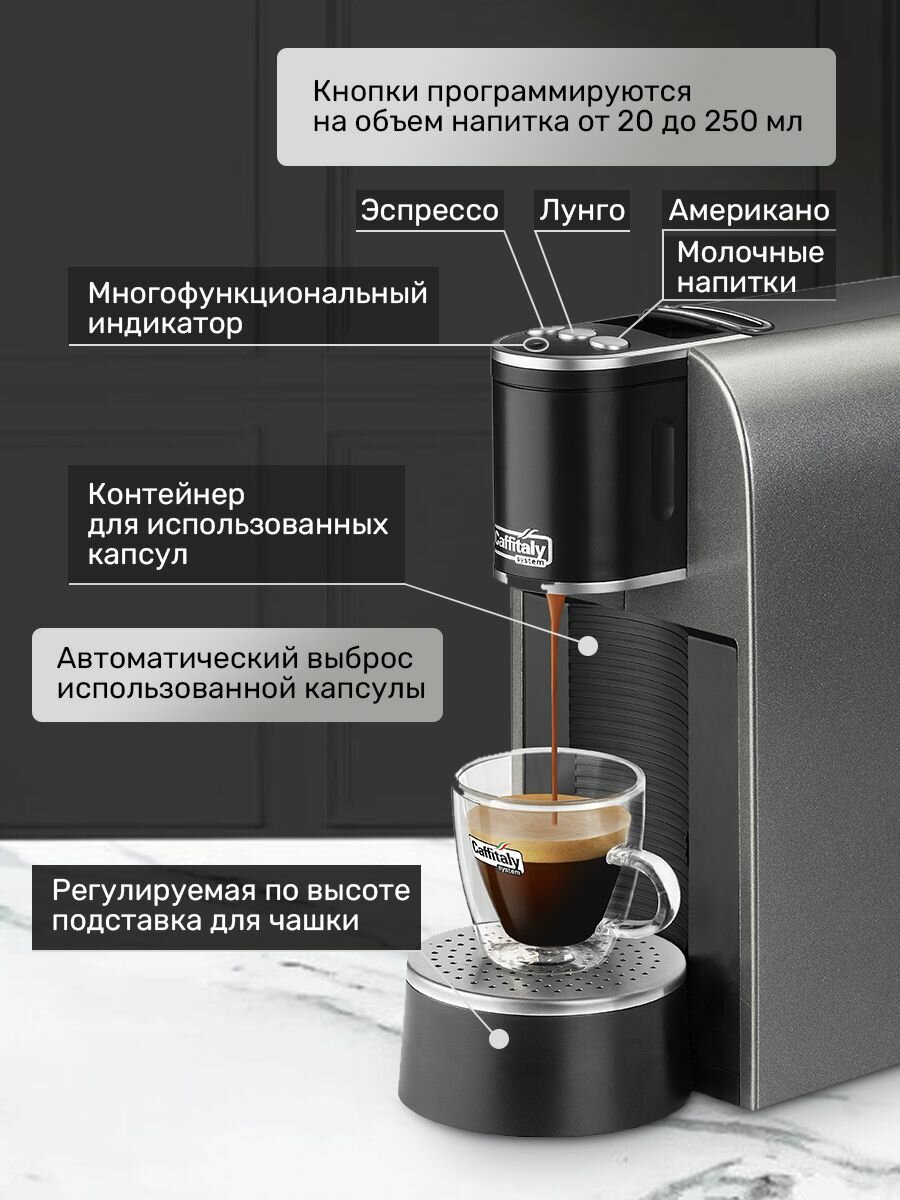 Совместимые капсулы следующих систем: Caffitaly; K-fee; Pauling,Рекомендованные производителем Оригинальные капсулы Caffitaly содержат больший объем кофе и имеют две мембраны для получения бархатистой пенки