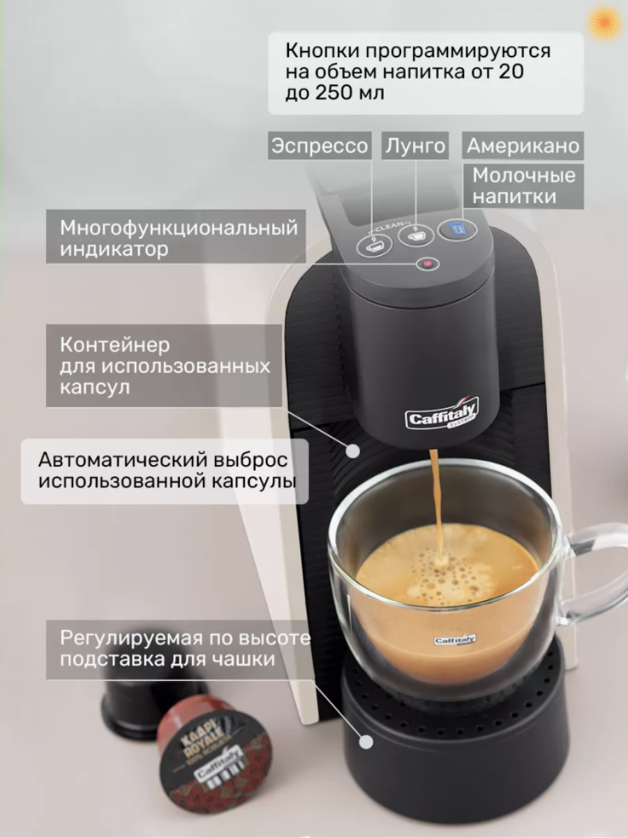 индикатор включения, контейнер для отходов, подсветка дисплея, съемный лоток для сбора капель