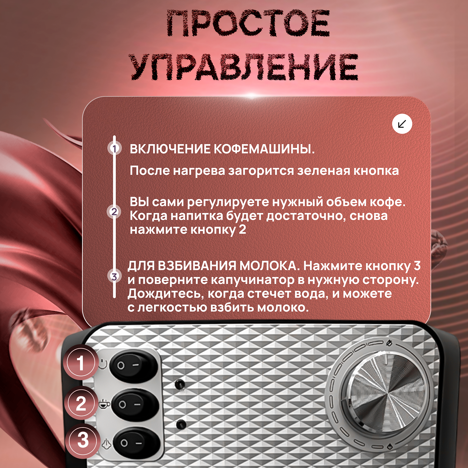 Специальный капучинатор для пены и подогрева позволит вам приготовить капучино и латте, добавив в ваш кофе нежную молочную пенку. Легкое управление одним касанием упростит приготовление кофе даже для начинающих пользователей.