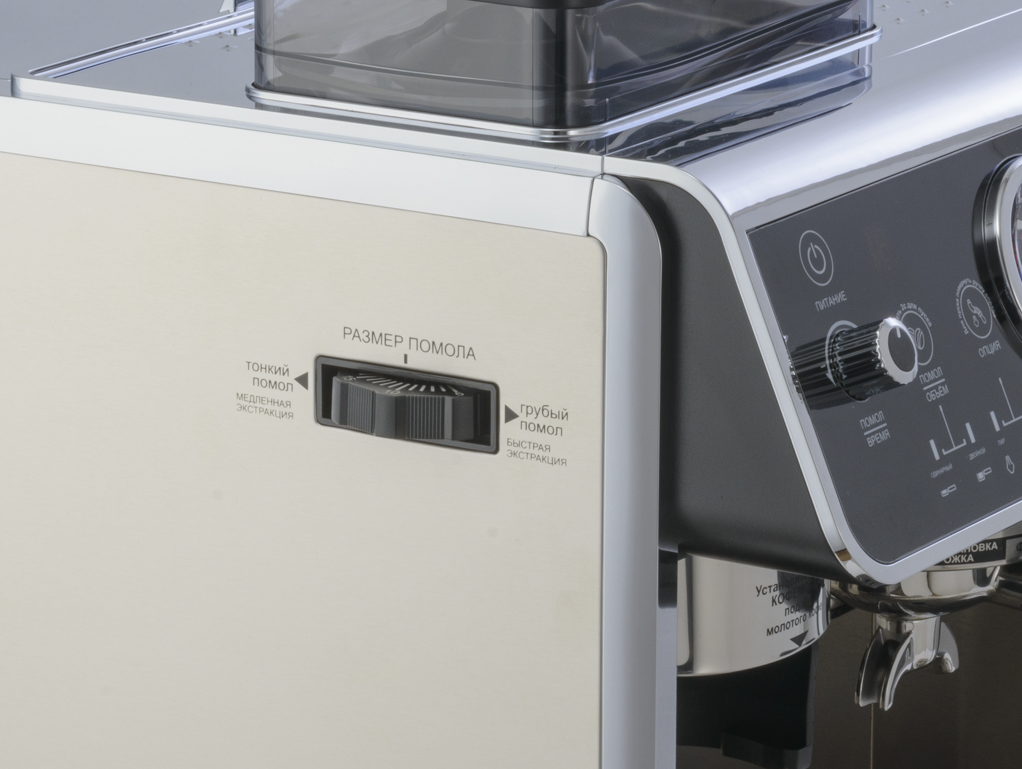 - При использовании встроенной кофемолки доступно ручное регулирование степени помола под ваши предпочтения, а также выбор количества помола - на одну , или на две порции.