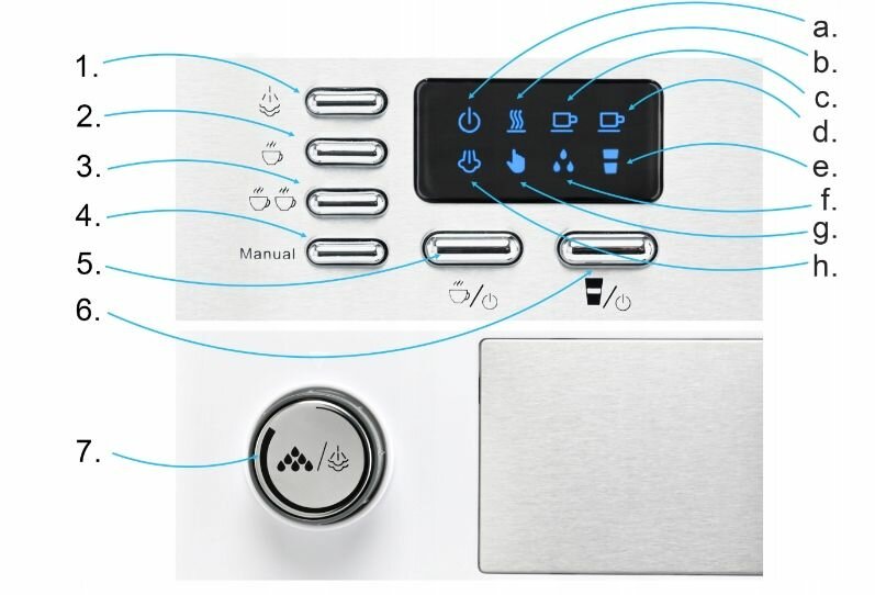 дисплей, индикатор уровня воды, индикация отсутствия кофе, индикация работы