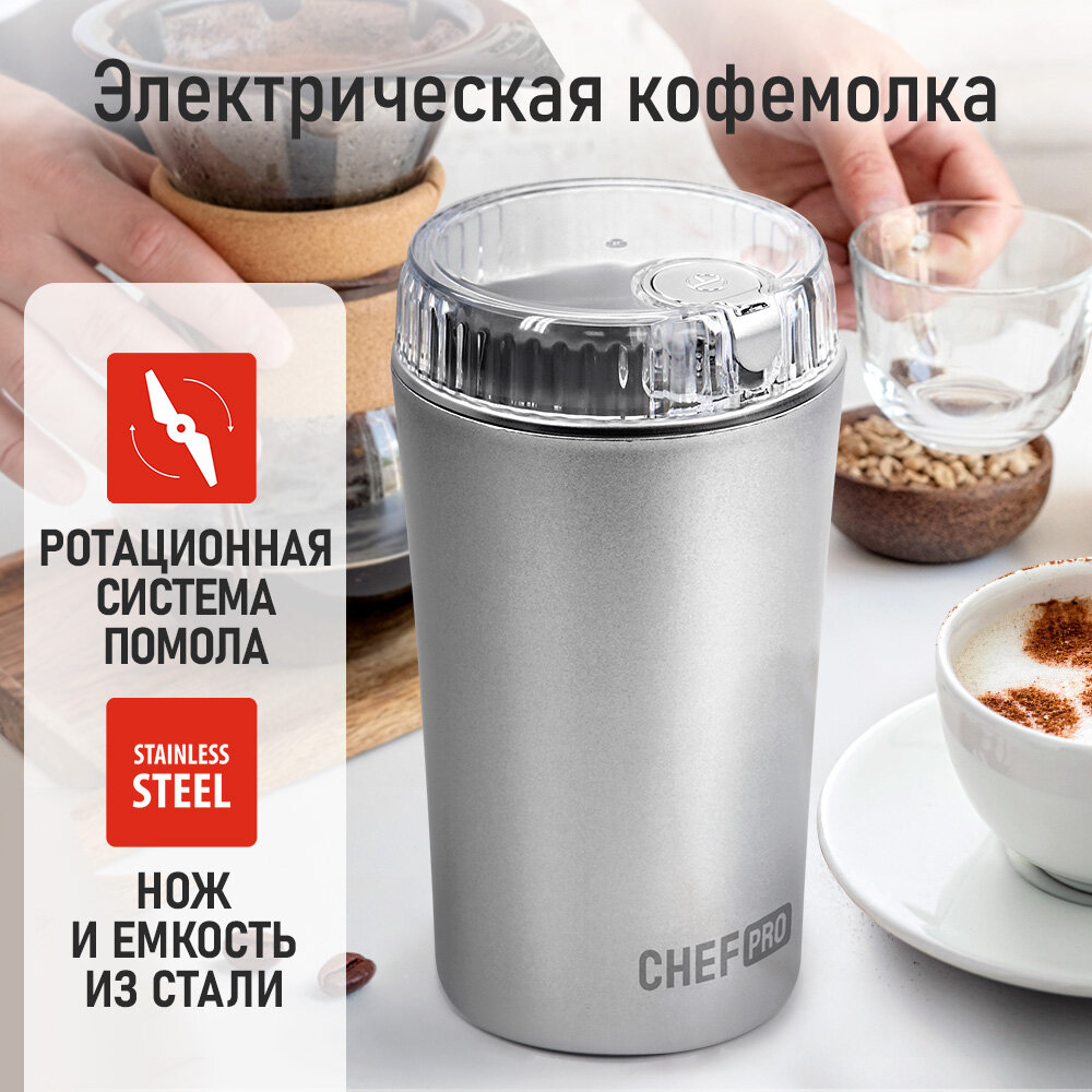 Купить Кофемолка CHEF PRO CF-CG1402A серебро/серебряный хром с доставкой по всей России. Кофемолка CHEF PRO CF-CG1402A серебро/серебряный хром: сравнение цен, характеристики, фото, актуальное наличие и цены.